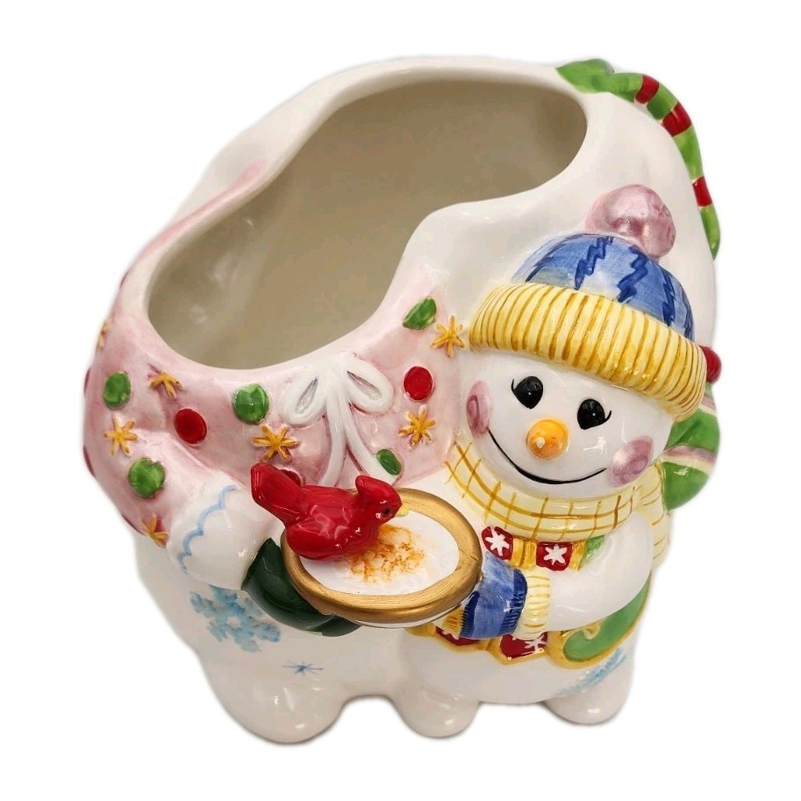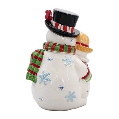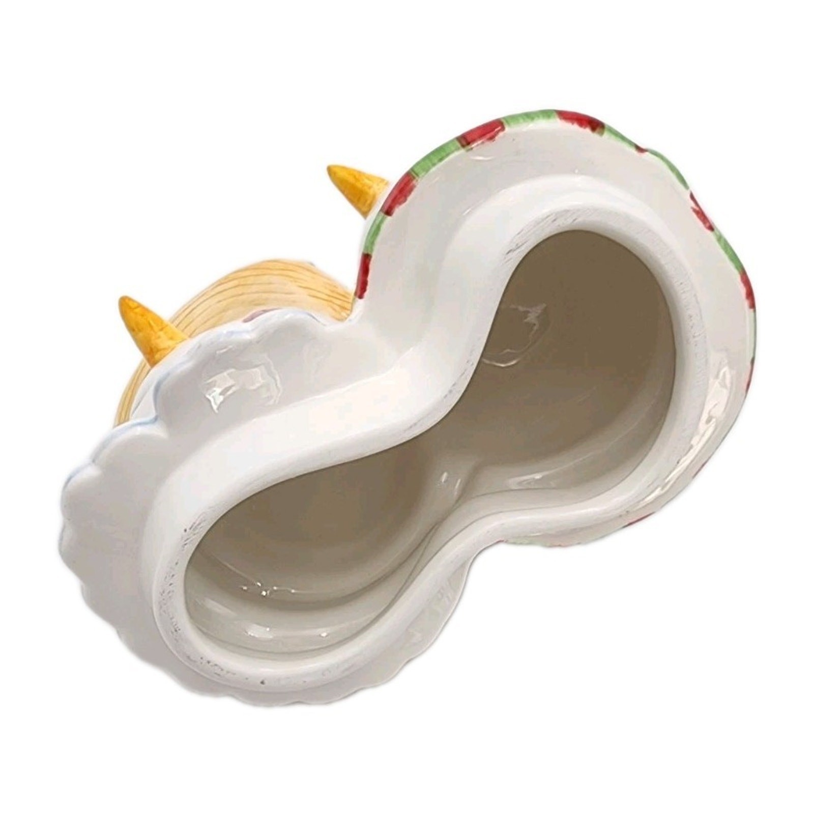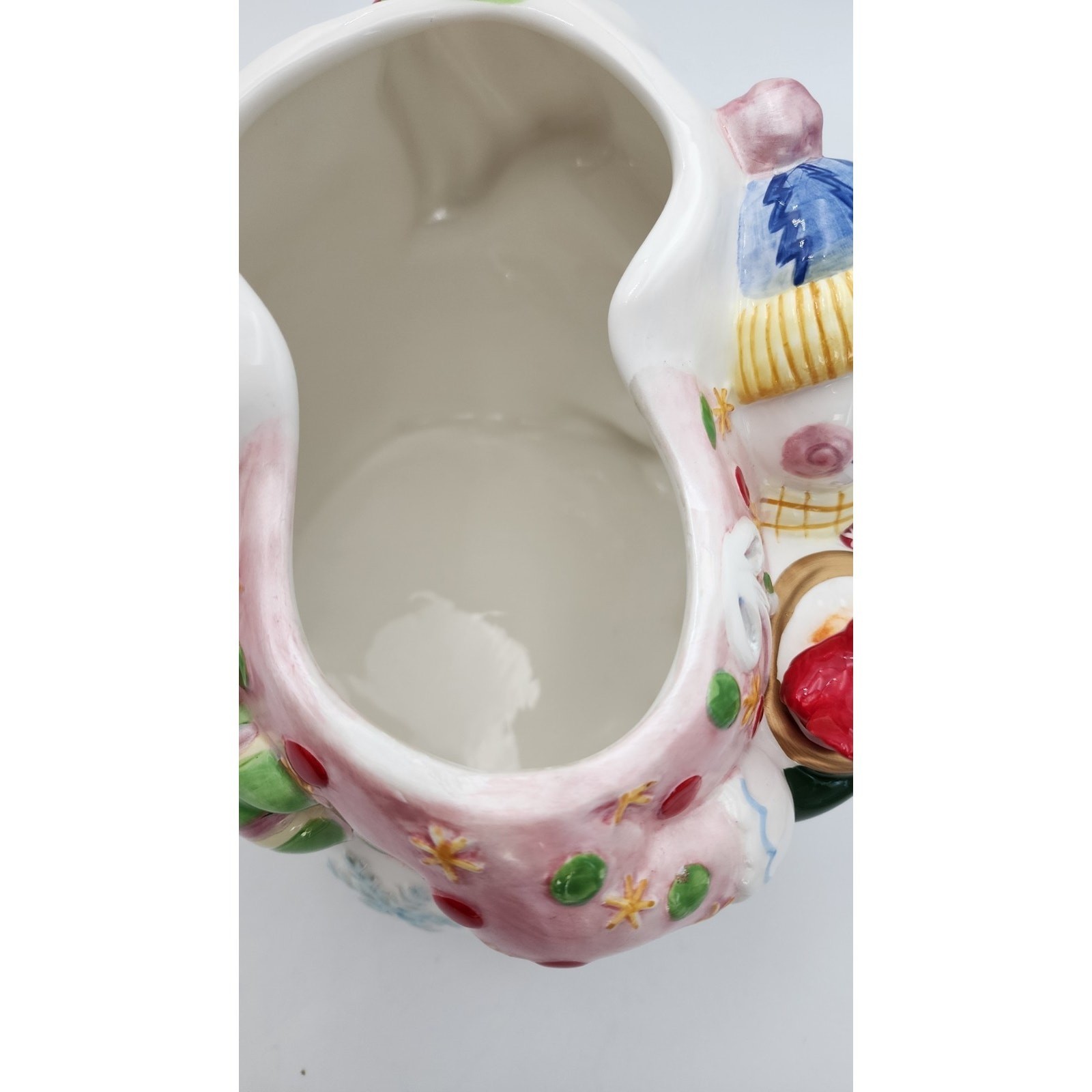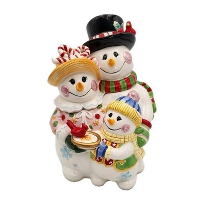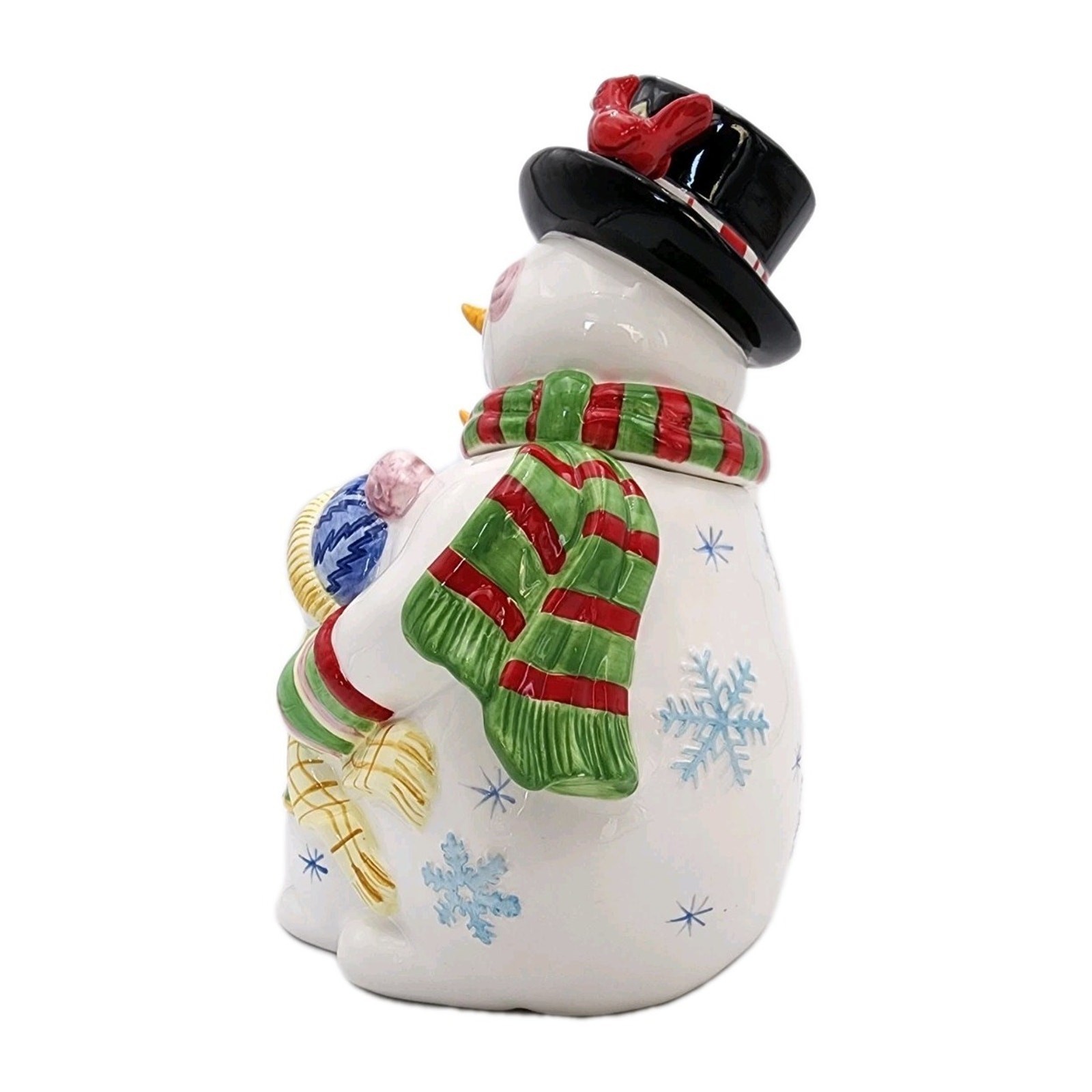 Add some vintage charm to your holiday kitchen with this Fitz and Floyd Frosty Friends Cookie Jar. The jar is made of ceramic and porcelain and features a lid to keep your cookies fresh. The colorful design of the jar is perfect for the Christmas season and will add a festive touch to your decor. This original piece is 12 inches tall and 7 inches wide, making it a medium-sized jar that will fit perfectly in your pantry or on your countertop.