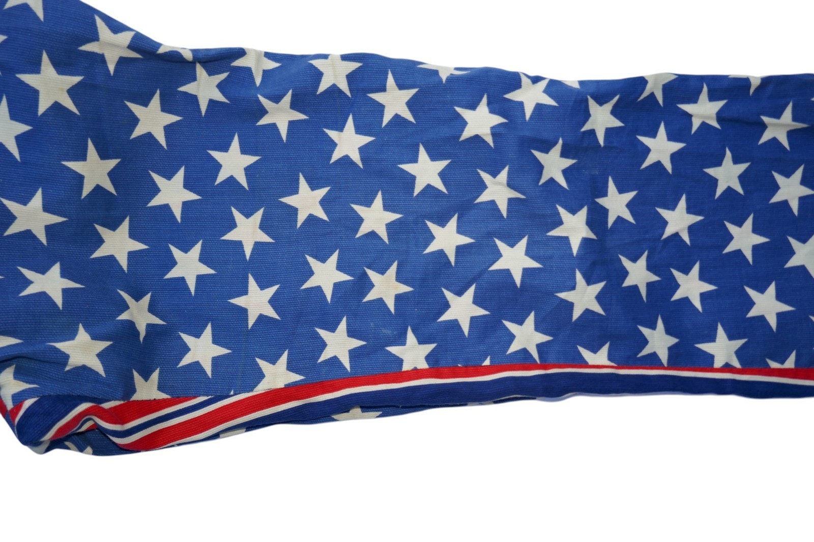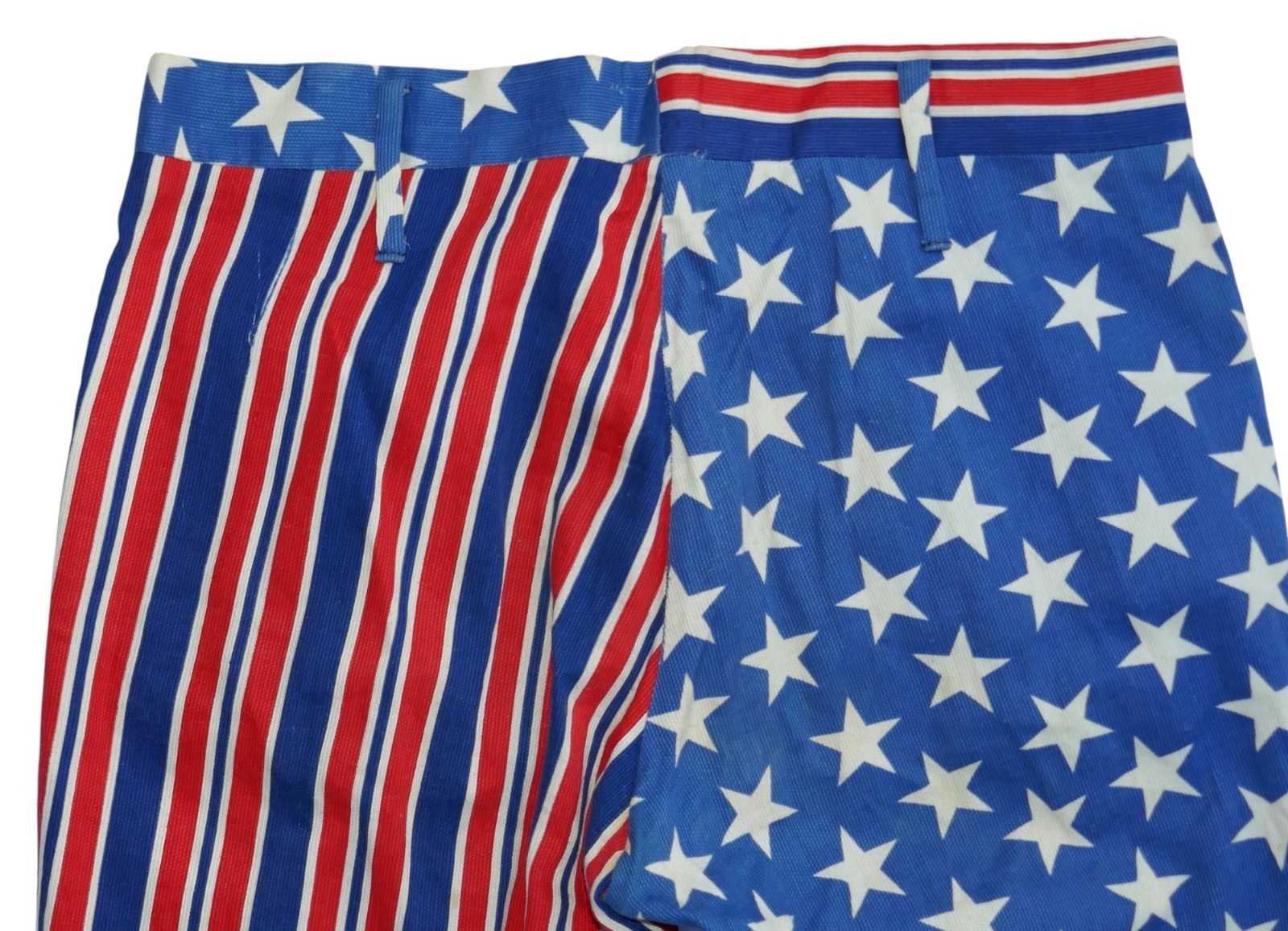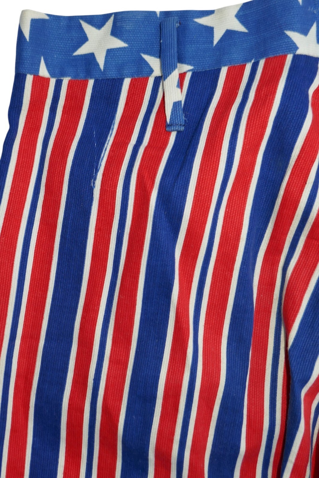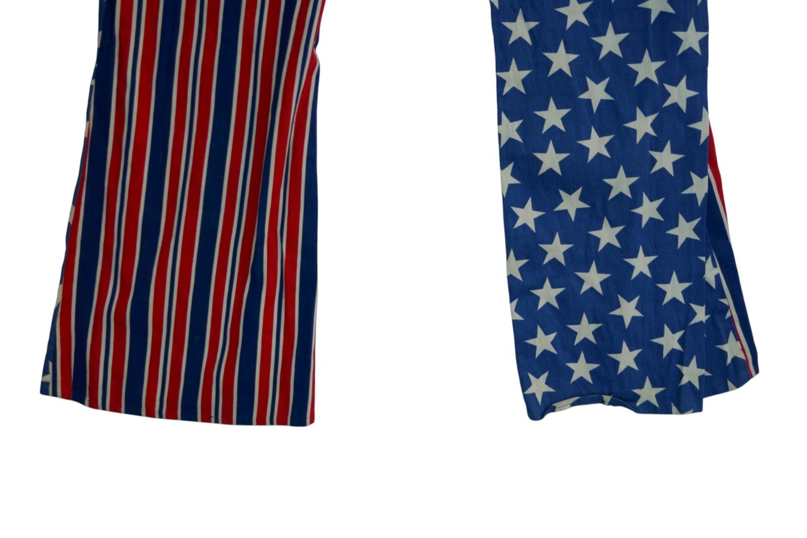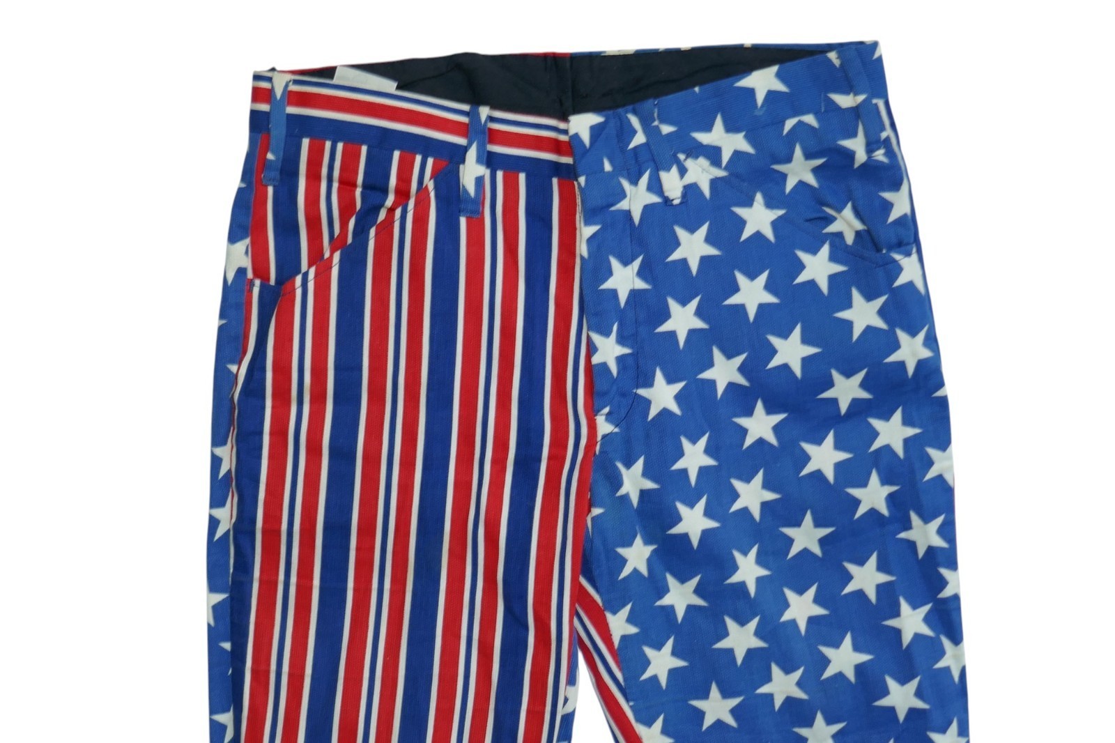 This is a pair of vintage Male Slacks Jeans with an American flag design of stars and stripes. The pants feature a mid-rise fit with a flared style, classic denim fabric, and a multicolor striped pattern. They measure approx. 14.5" across the waist with 29.5" inseam. These do have some flaws due to age - yellowing, small spots and torn fabric around the fastener. Perfect for summer, fall, and spring, these slacks offer a comfortable and stylish option for women looking to make a statement.