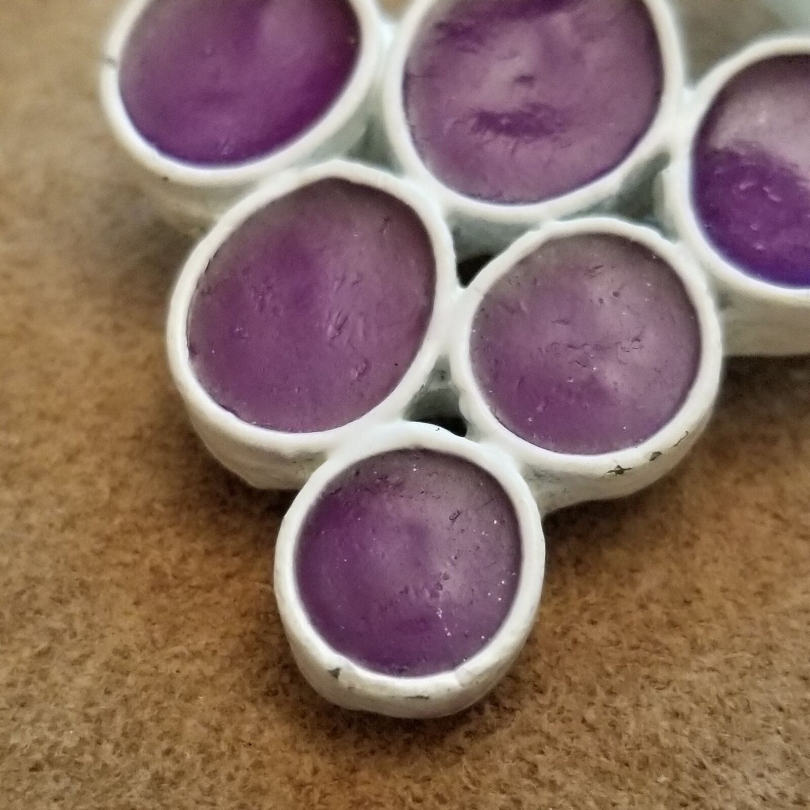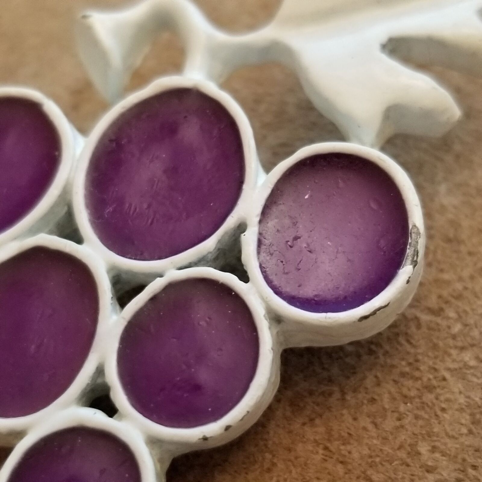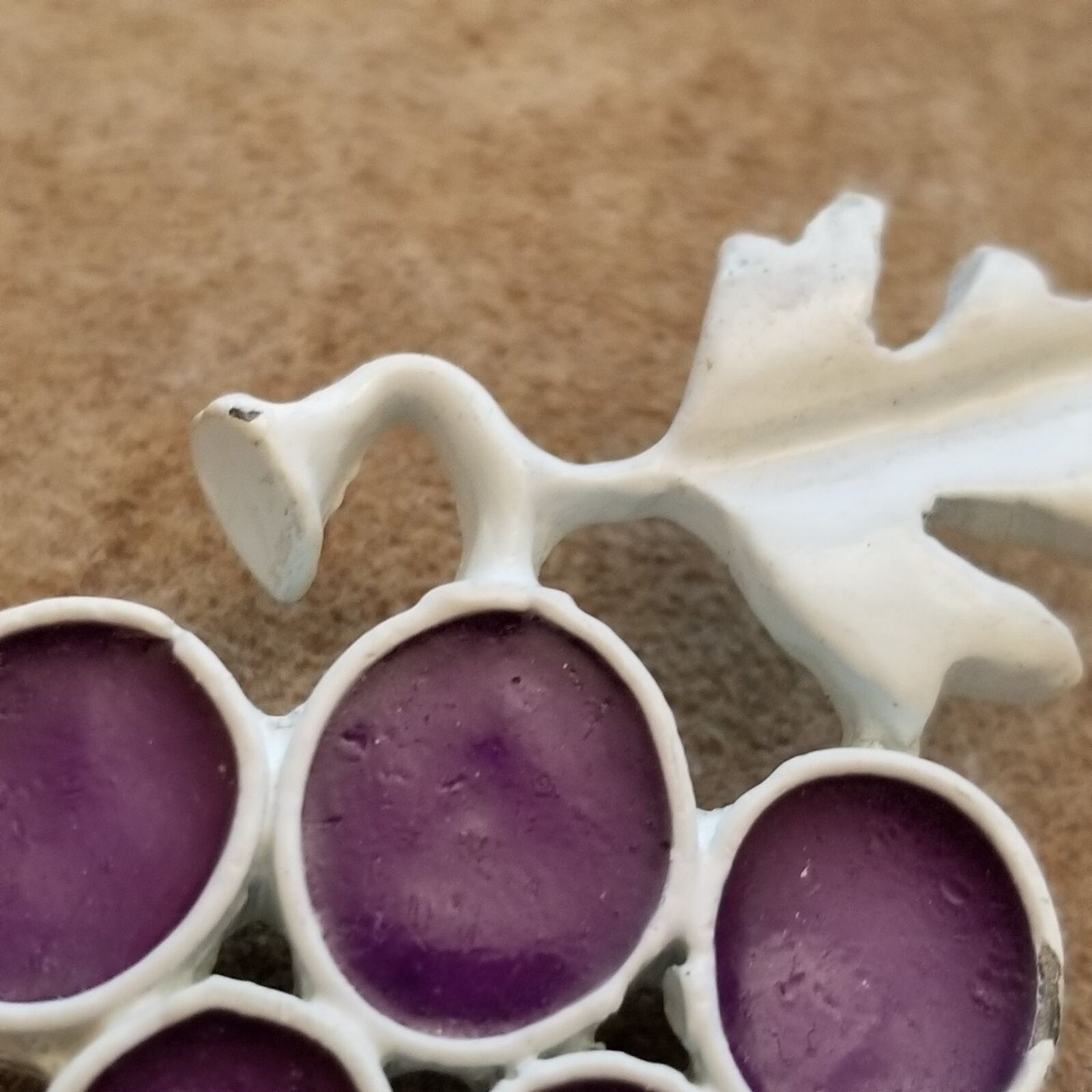 Vintage White Enamel Metal Grape Cluster Brooch – Purple Cabochon Grapes Pin