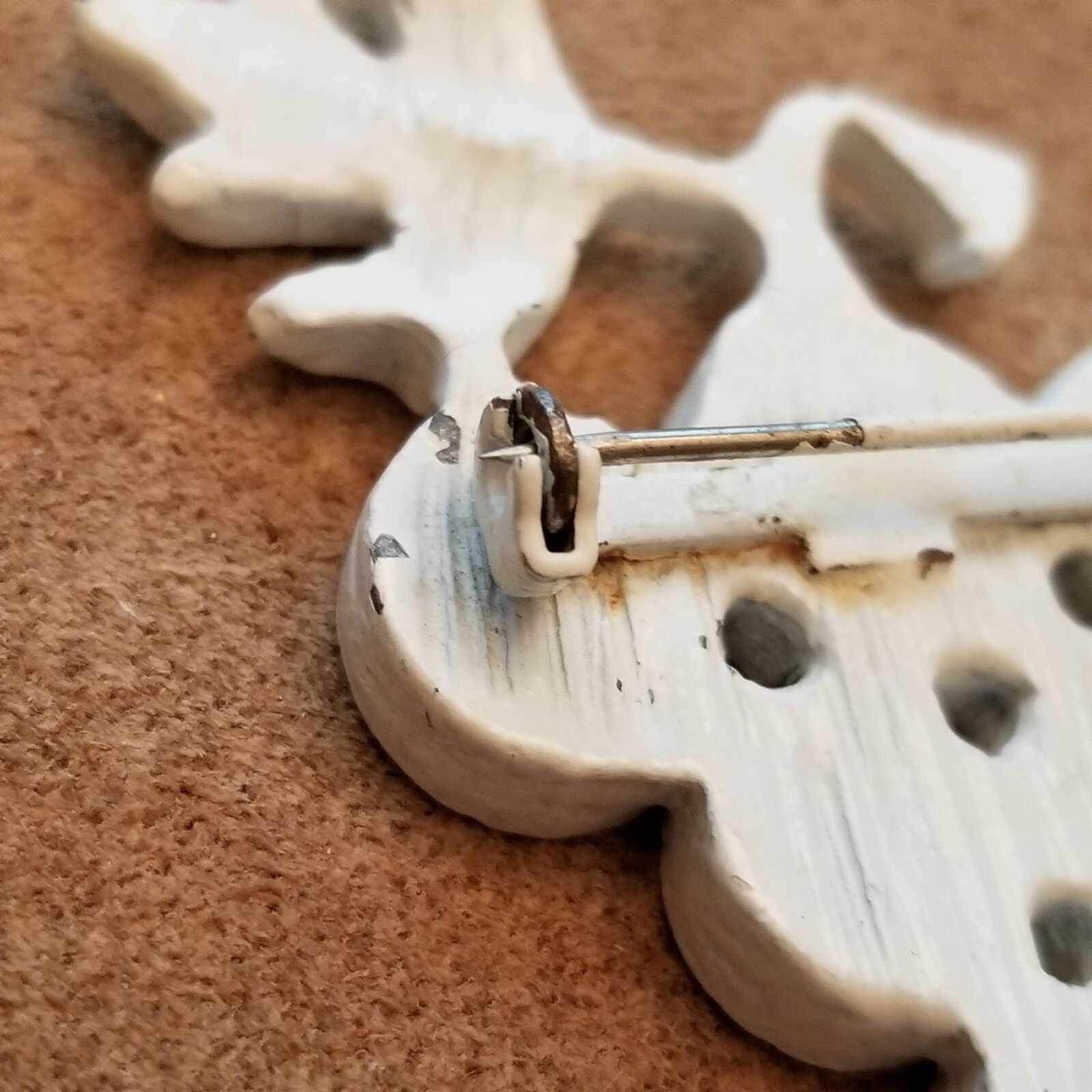 This vintage grape brooch features a playful cluster design with deep purple cabochons set in a white enamel-coated metal frame. Topped with a detailed grapevine leaf, this brooch captures a charming retro look perfect for fruit-themed or novelty jewelry collectors. Its bold color contrast makes it a fun accessory to add to jackets, scarves, or hats.