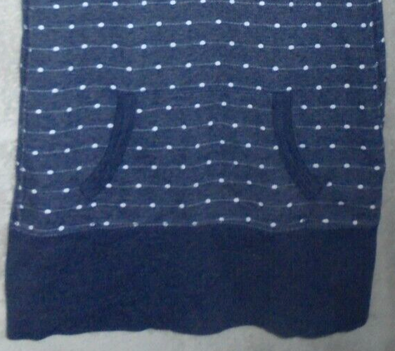 Description: Nice stretchy knit pullover sweatshirt with scoop crew neck and front pocket. Ribbing on cuffs and hemline. Blue with raised white polka dots.