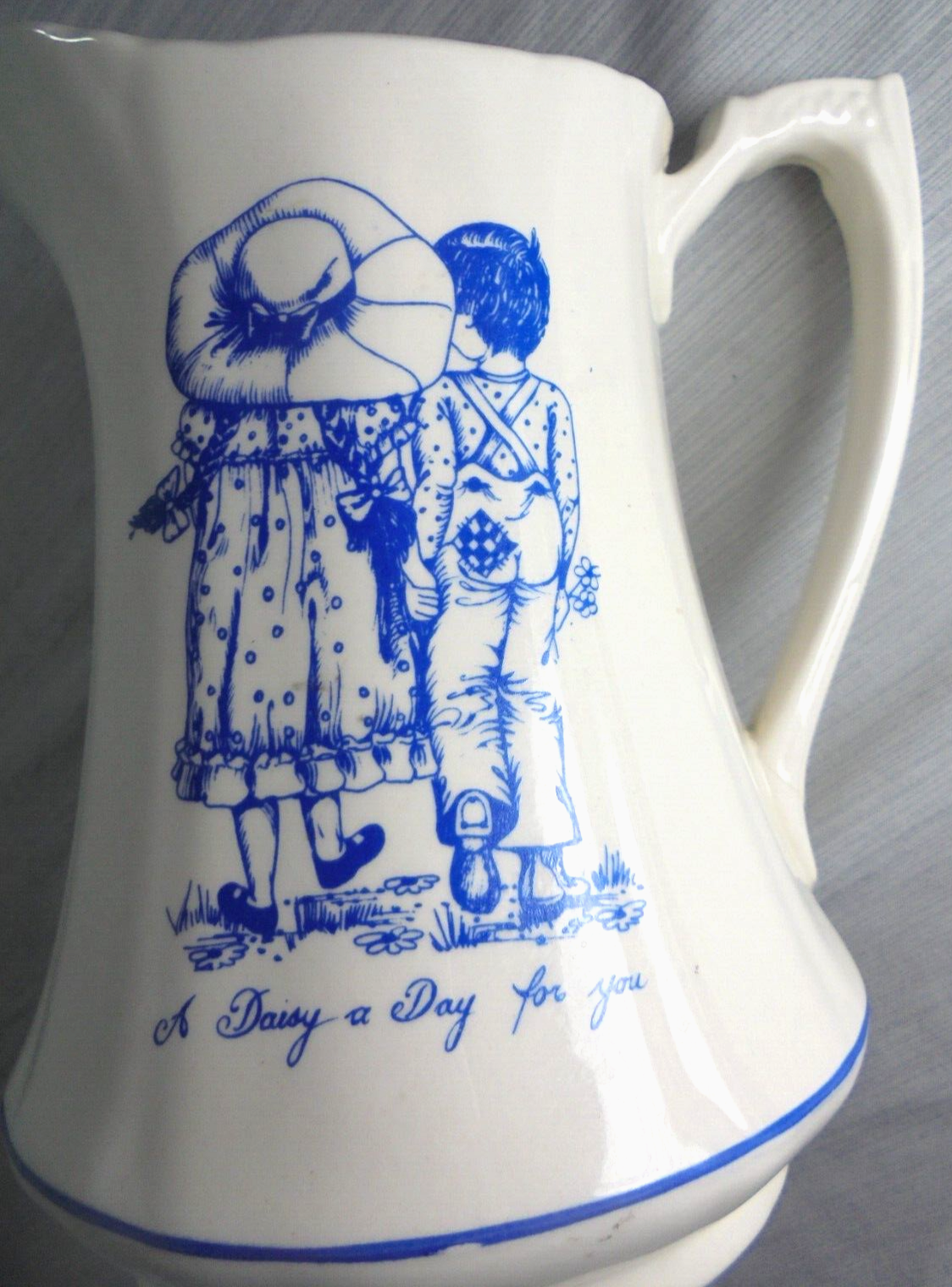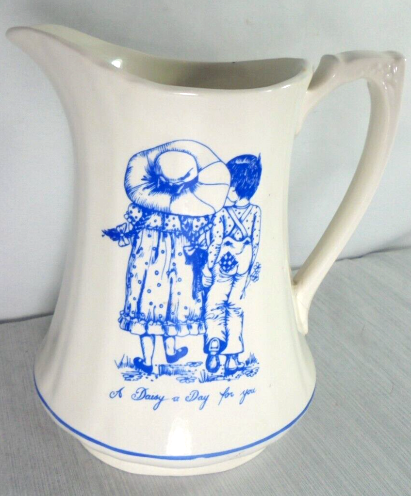 Description: Vintage 1974 pitcher with picture of boy and girl walking hand and hand. "A Daisy a Day For You in cursive text. Crownford China Co.