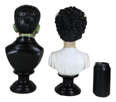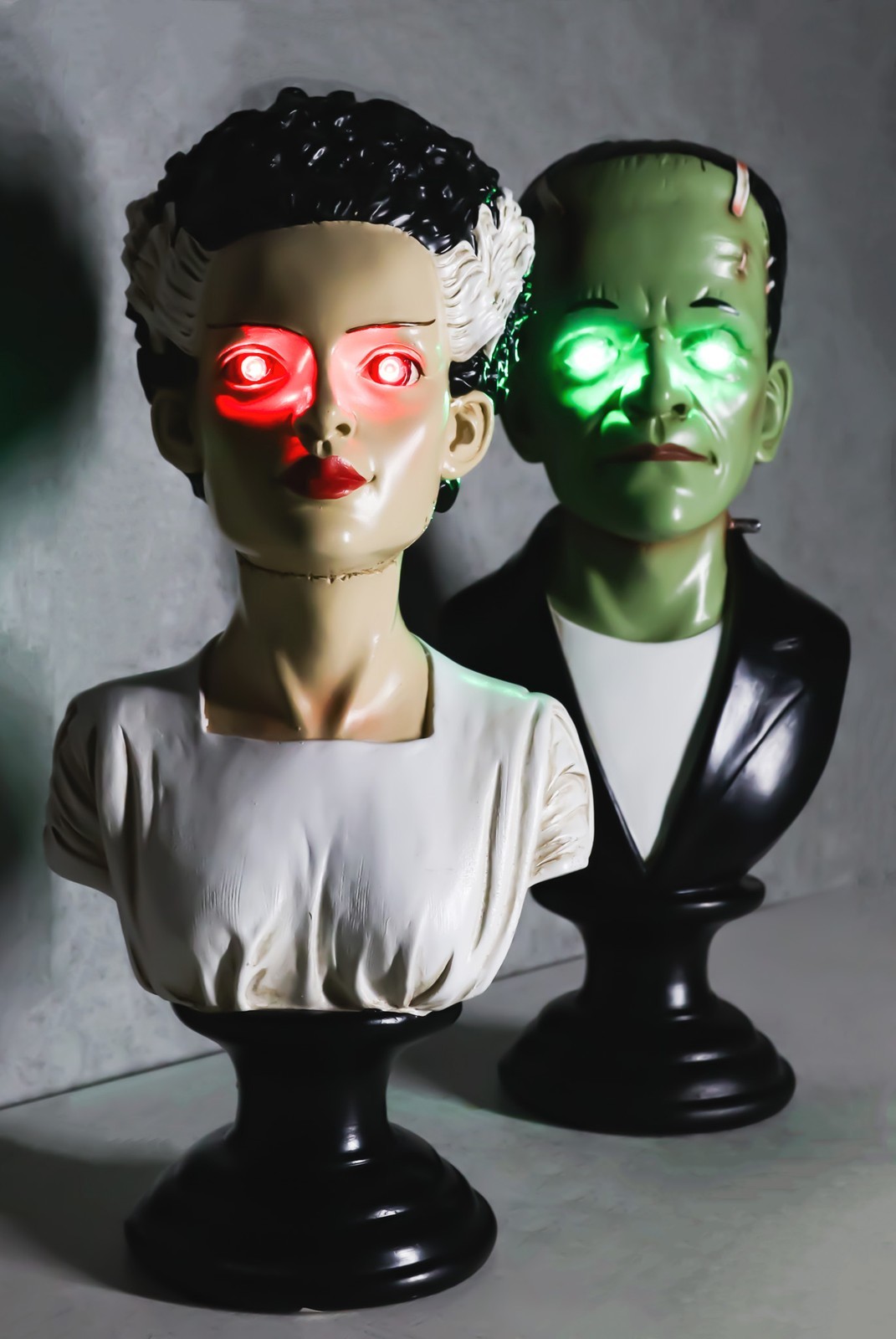 ? Elevate your collection with our mesmerizing Mr. Frankenstein and The Bride bust sculptures, now brought to life with a captivating twist. These iconic characters are meticulously crafted to capture every intricate detail, from the metal elements on Mr. Frankenstein's forehead to the delicate beauty of The Bride's visage. What truly sets these sculptures apart is their piercing LED eyes, casting an eerie and enchanting glow that adds a dynamic and unique dimension to your display.