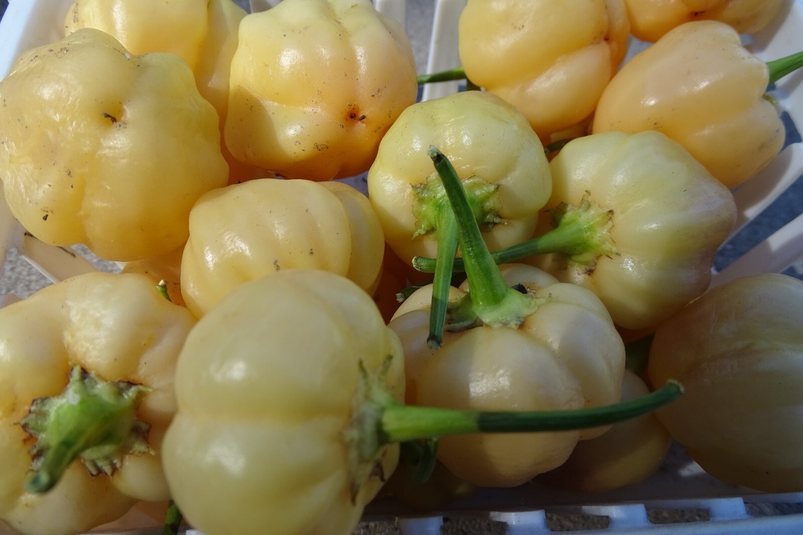 Wow, what a find! I understand this pepper was bred or discovered by Chris Folwer, The fruit starts out green, turns yellow with faint purple on the shoulders and finally a bright apricot color. It has the fruity aroma of a habenero, but without the intense heat. The thicker flesh makes the pepper perfect for pickling.