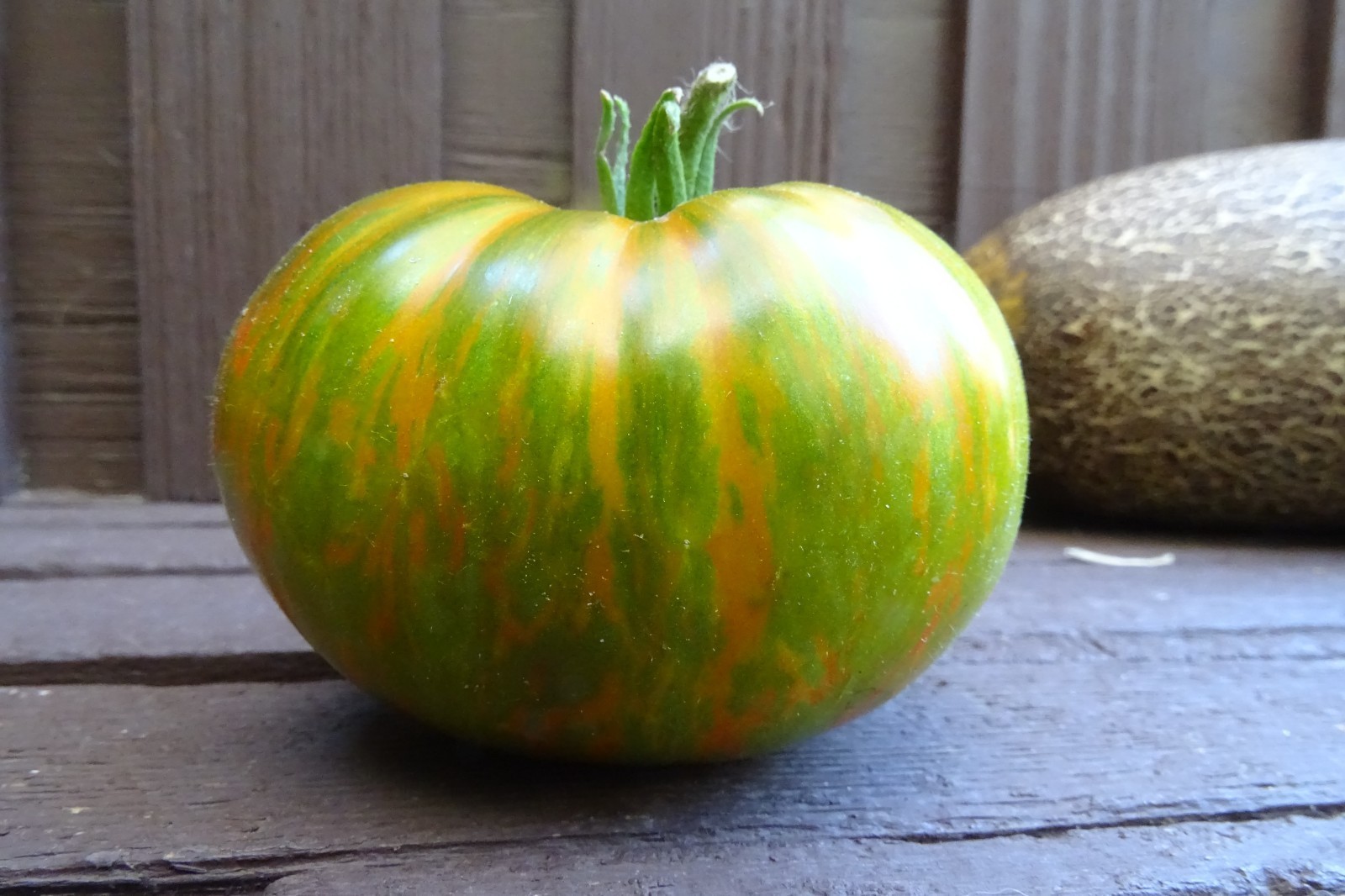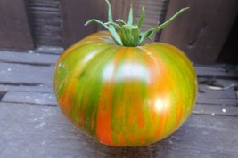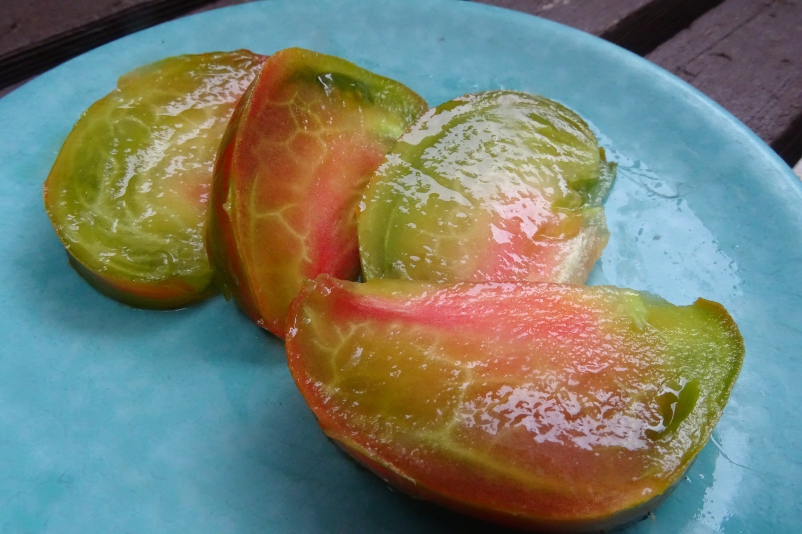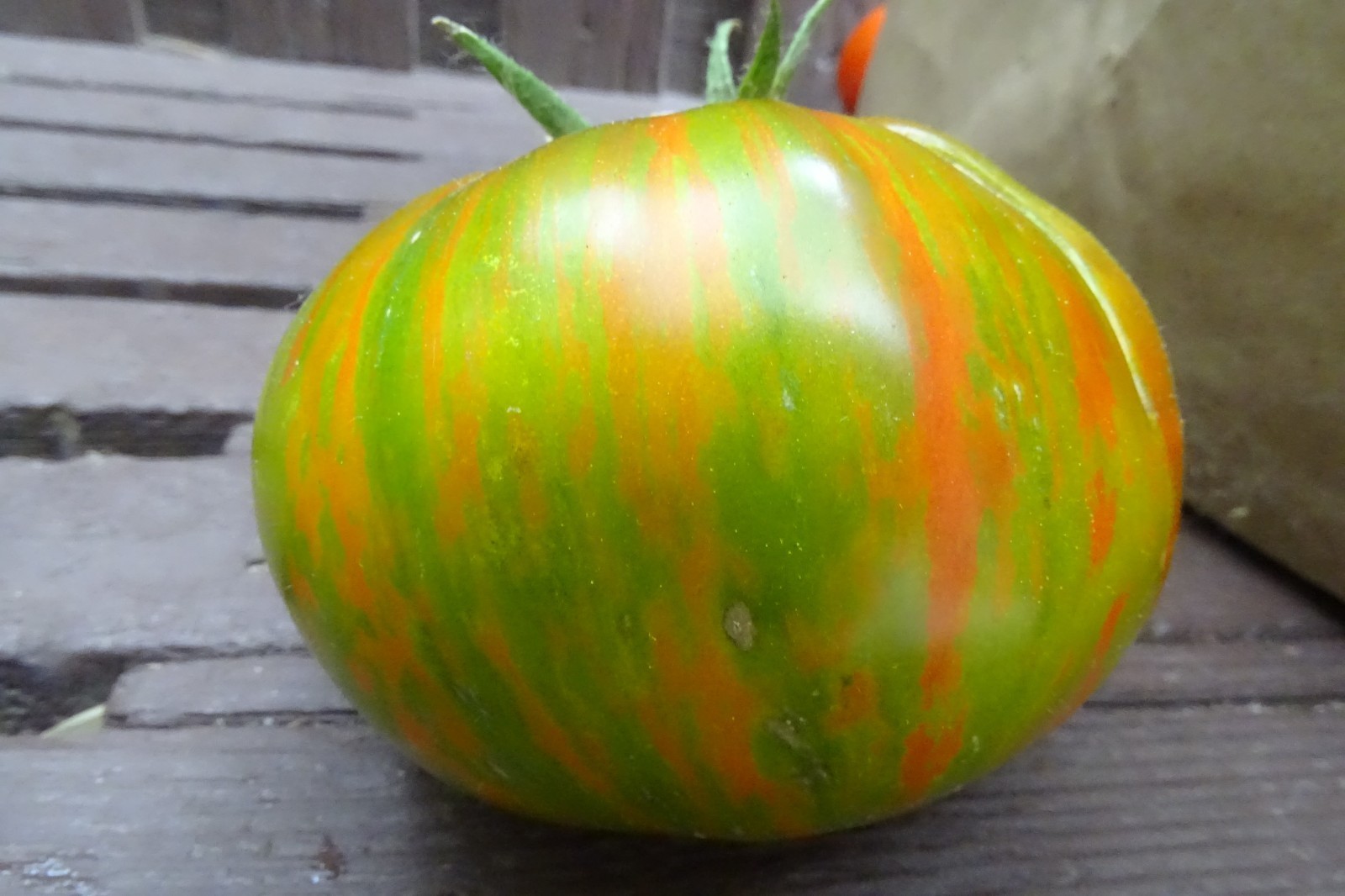 This variety was developed by Brad Gates of Wild Boar Farms. He describes it as an improved strain of Berkeley Tie Dye and I found it to be slightly smaller, but earlier and more reliable and prolific. It certainly is a striking tomato with a beautiful interior. The flavor is tangy sweet.