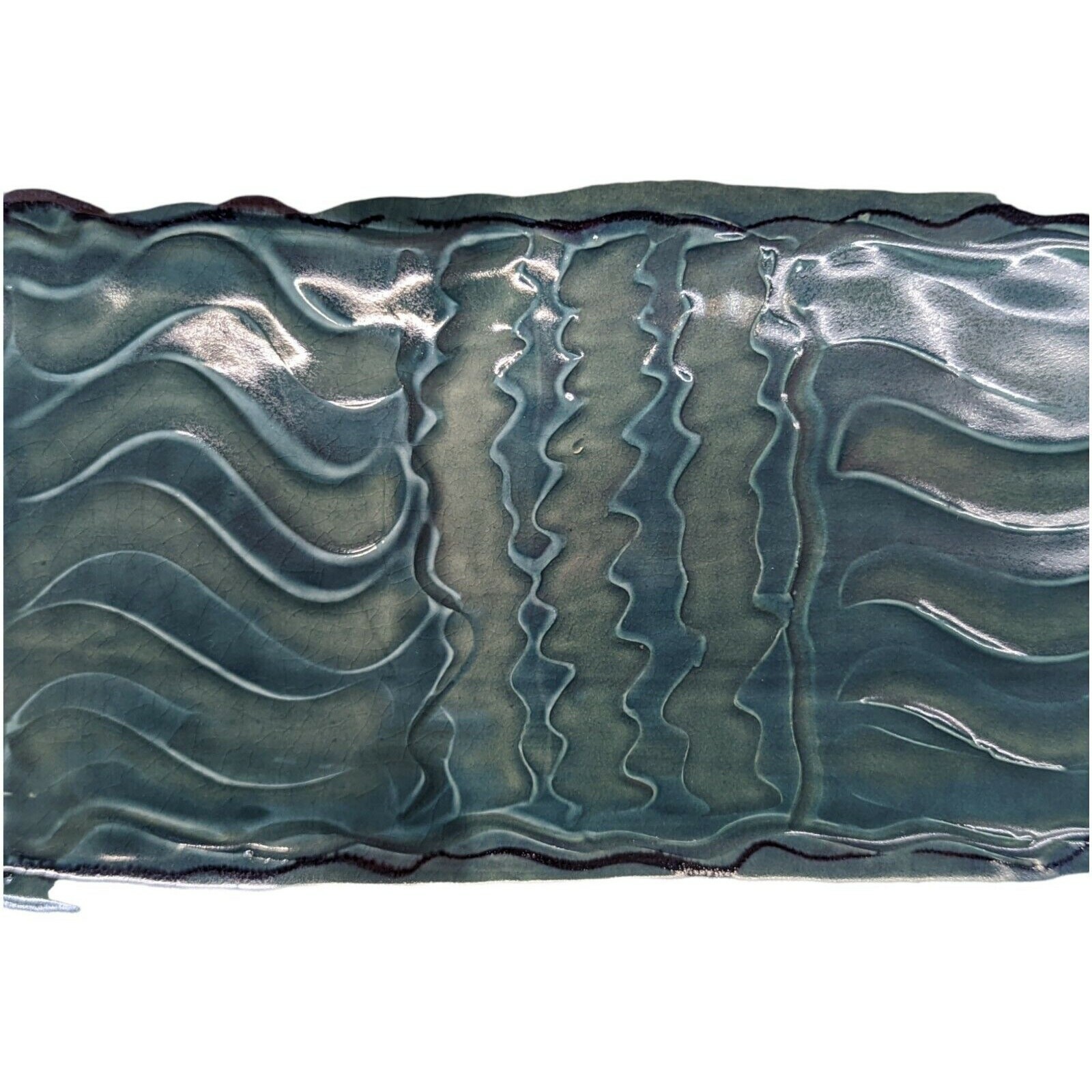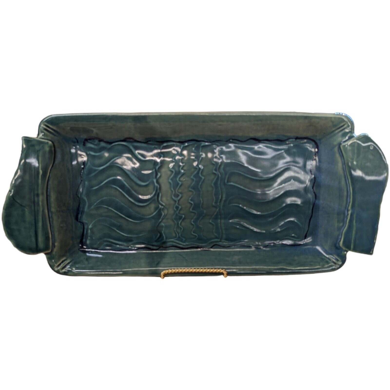 Signed Pottery Serving Dresser Dish Tray Blue Green Wave Pattern Beach Water