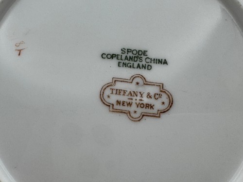 This is the cream color variety of the Spode Sheffield pattern. The front is cream color while the back is white. The plates have a Tiffany Co. retail mark. They measure 6 1/8" in diameter and are in very good estate condition with no chips, cracks, or excess wear.