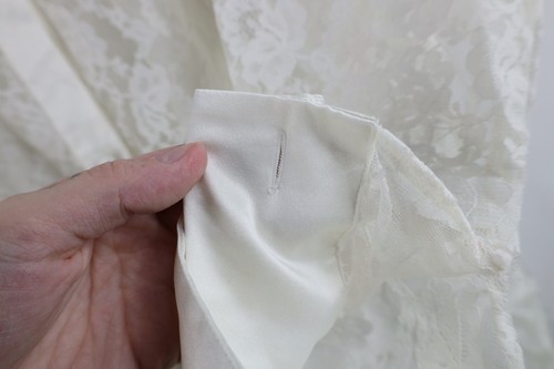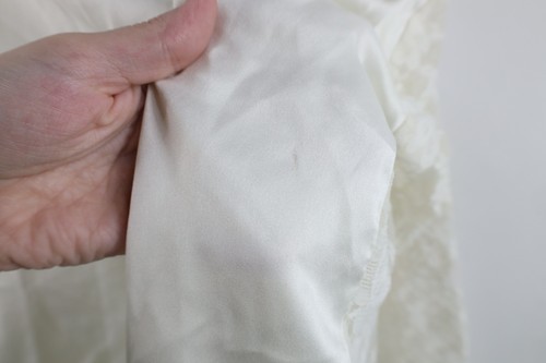Missing buttons left cuff. Stains back right. Collar, front, cuffs discolored. Yelllowed. Tag cut. Sheer fabric
