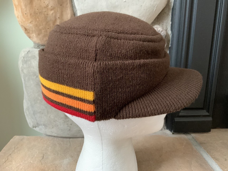 Corona Hat Patrol Cap. Brown Knit with Three Retro Stripes Winter Excellent One Size.