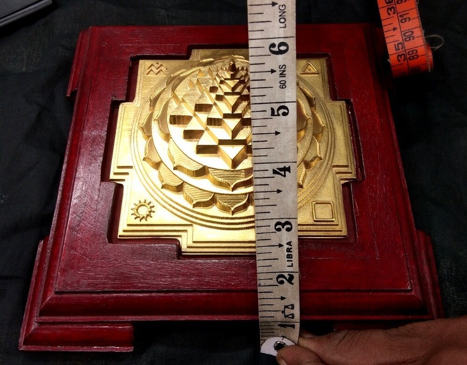 Shree Yantra kann aus einem Kristallstück gemeißelt werden, das auf Kristall, Edelsteinen, auf Kupfer- oder Silbermetallen in einfachen Planen oder erhohten Planen eingraviert werden kann.