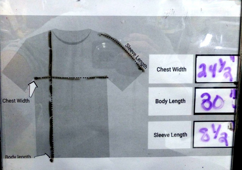 Chest Width = 24.5 inches, Body Length = 30 inches, Sleeve Length = 8.5 inches