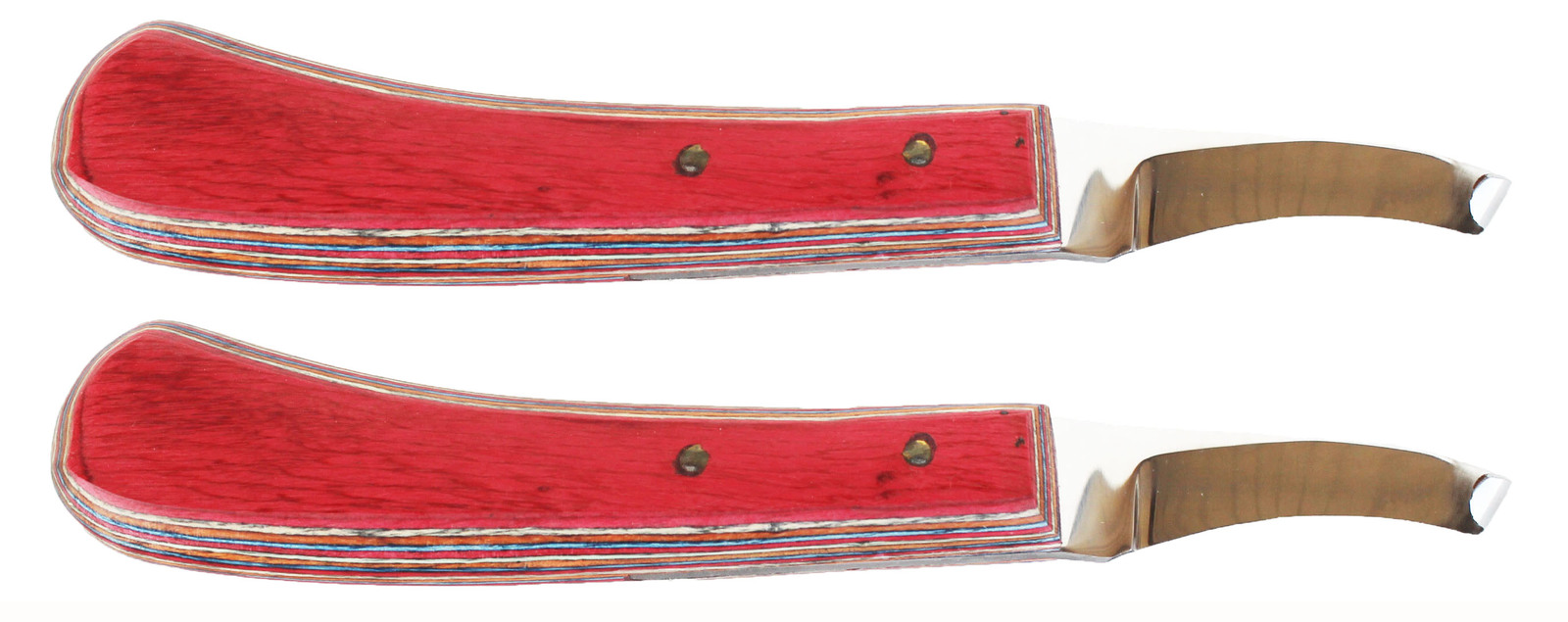 Set of (2) curved edge carbon steel durable hoof knifes ideal for the left handed individual. Features multicolor wood handle. Easy to re-sharpen, perfect for hard to reach areas. Measures approx. 8" long x 1 3/8" at widest part of handle.