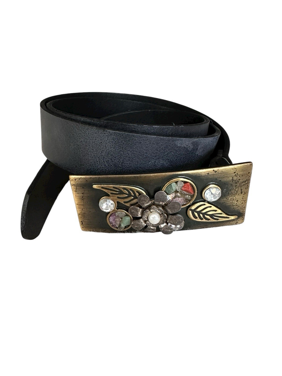 SERENO Italian Black Leather Belt With Metal Buckle Floral Embellished XL