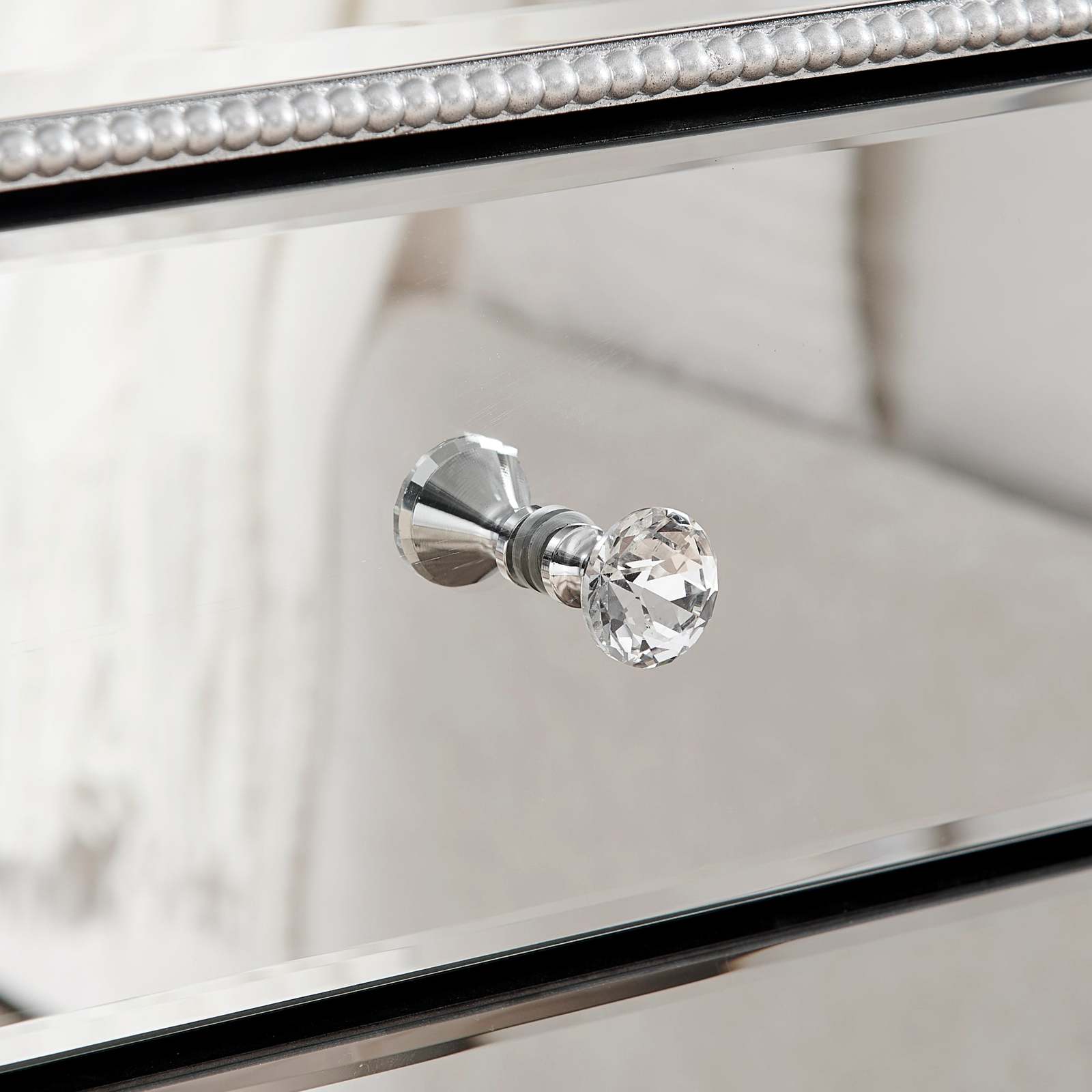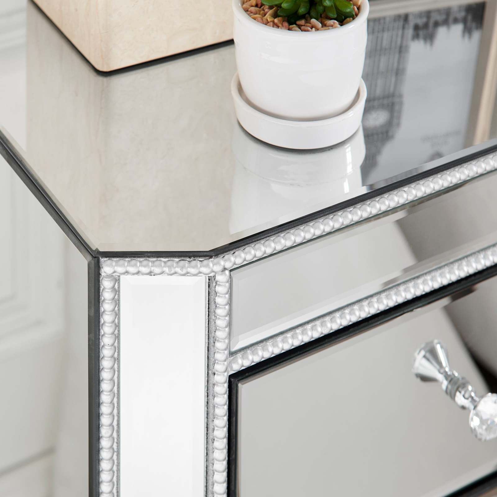 STYLISH DESIGN: With complete mirrored finish, the surface is very reflective that brightens up the space by reflecting the contents of the room. Silver beaded trim detail with mirrored finish. Round faceted glass drawer knobs.