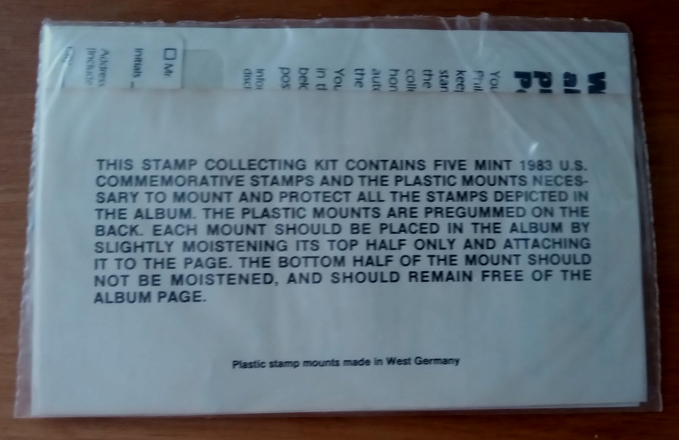 This stamp collecting Kit contains five mint 1983 U.S. commemorative stamps with the plastic mounts necessary to mount and protect the stamps.