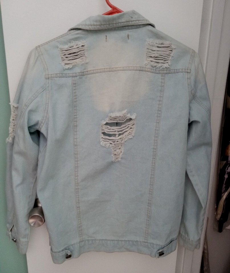 The light wash and extreme destructed detailing give this jacket a unique and edgy look. It's a perfect fit for those looking to make a statement with their clothing. The jacket is a medium, regular fit, and has a waist high length, making it a versatile piece that can be paired with many different outfits. The light blue color and jean material add to the jacket's charm, making it a great addition to any wardrobe.