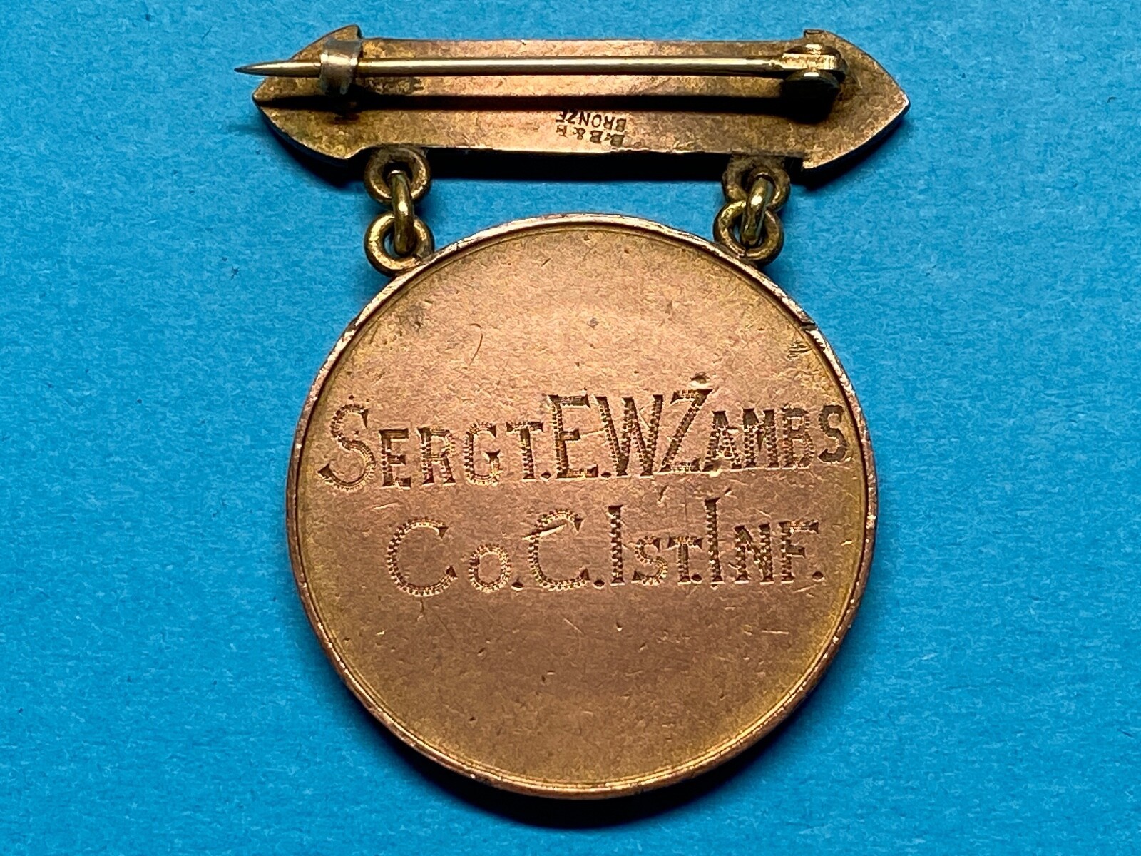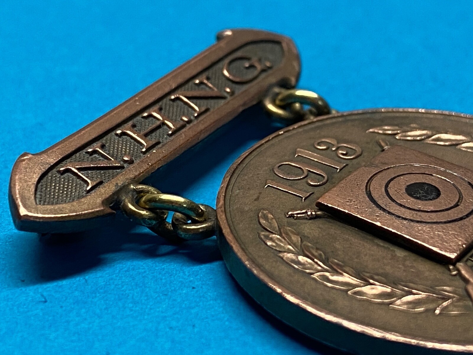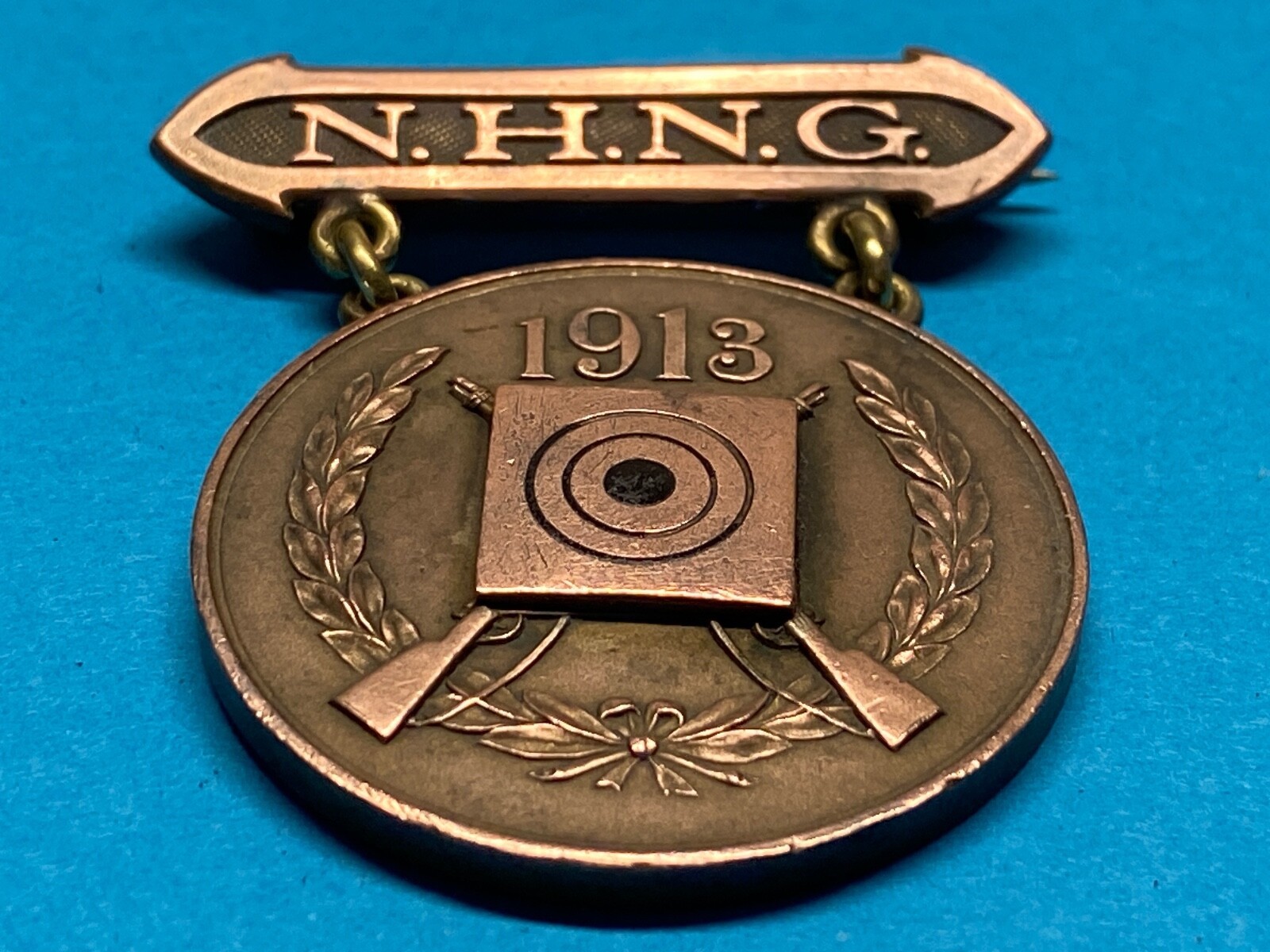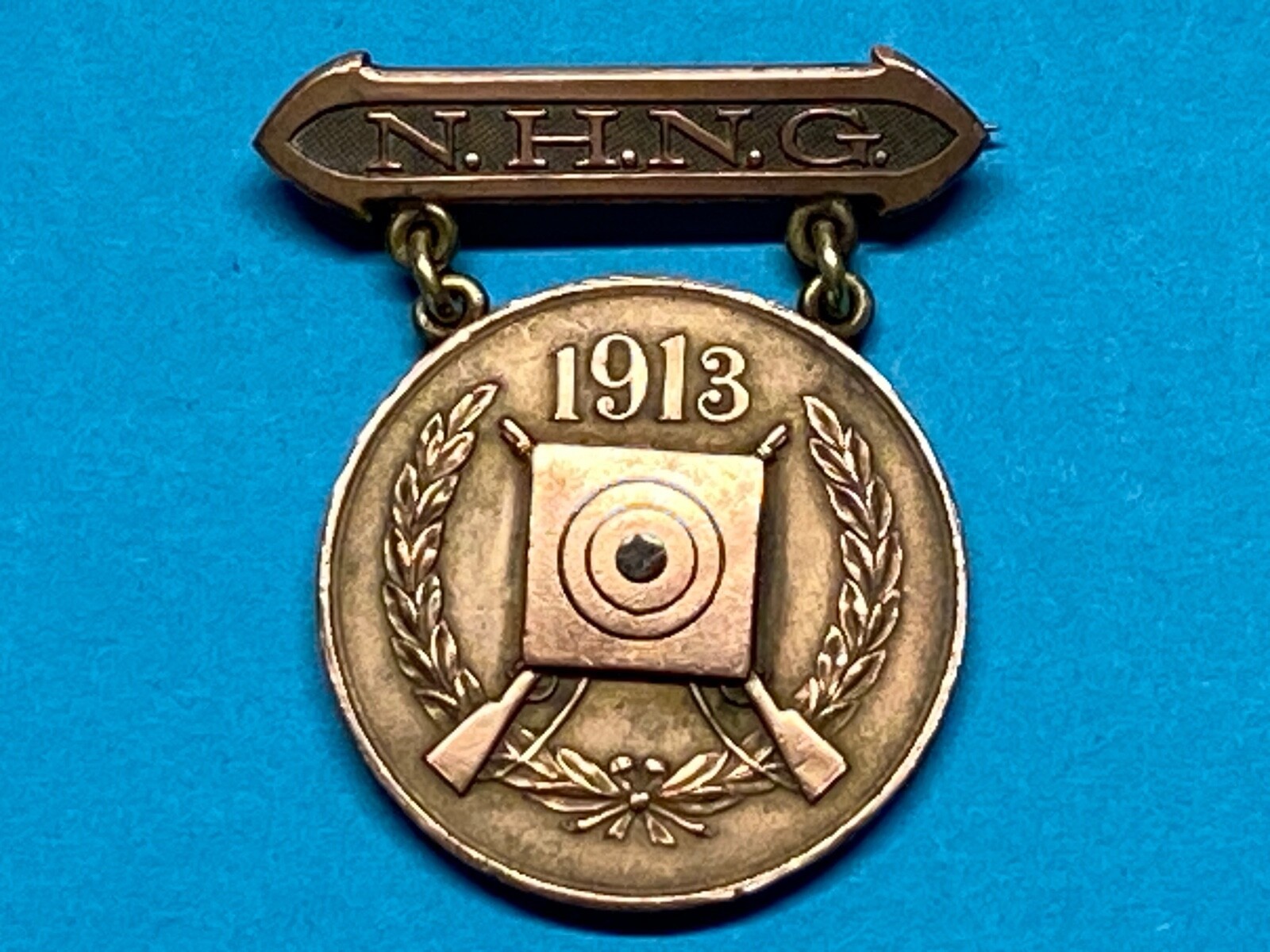 New Hampshire National Guard Shooting Medal N.H.N.G 1913. Pin-back. Gorgeous piece, hallmarked, BB B Bronze on reverse of suspension bar. (Bailey, Banks Biddle). Hand engraved on reverse: Sergt. E. W. Zambs / Co. C. 1st Inf. Sergeant Zambs died in 1918 due to pneumonia.