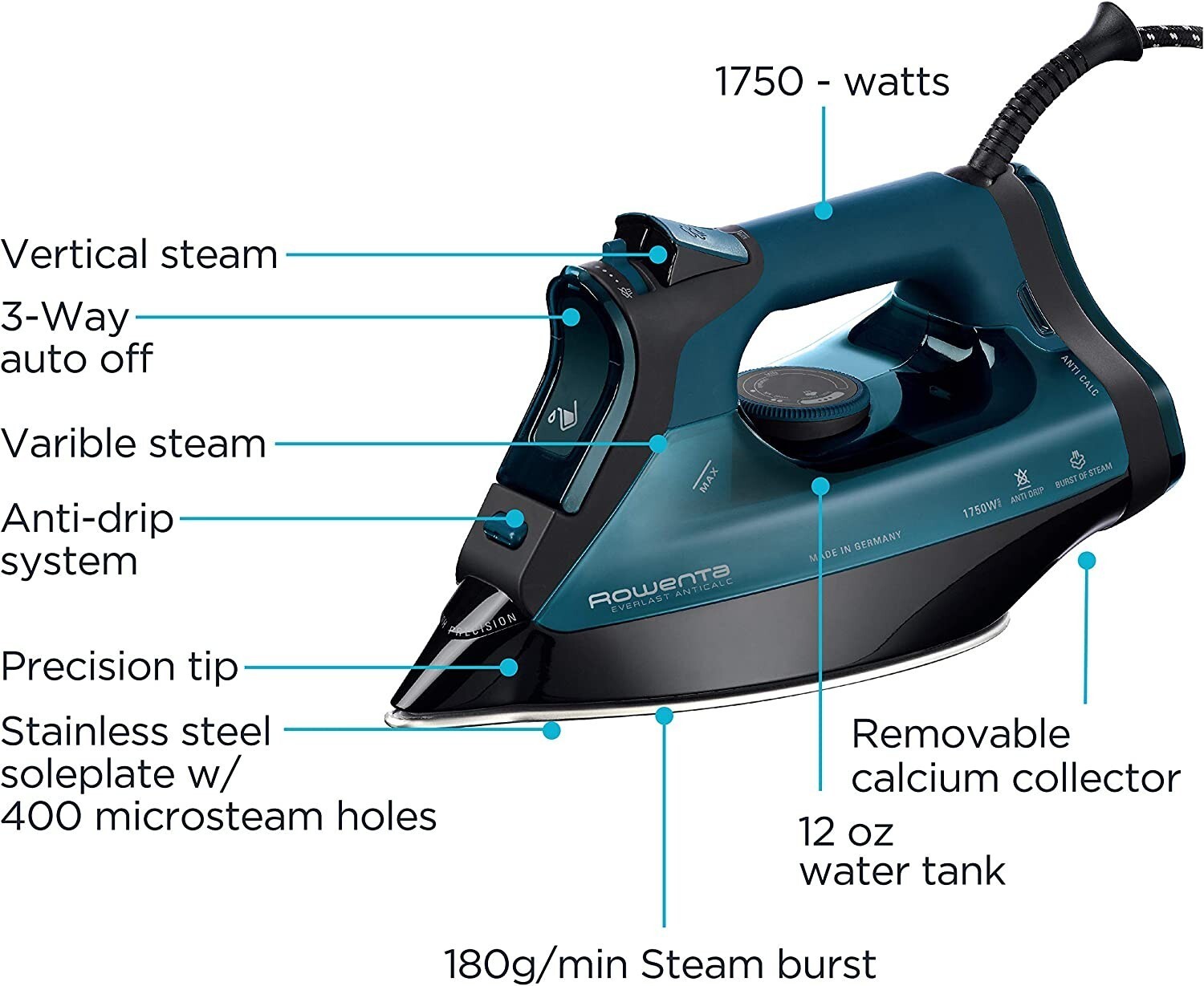 Rowenta DW7180 Everlast Iron 1750 w, Stainless Steel Soleplate Made In Germany