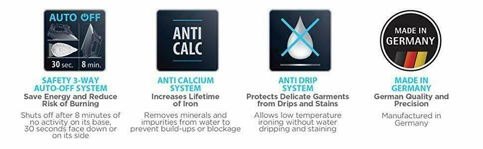 SAFETY COMES FIRST WITH ROWENTA - 3-way auto-off feature shuts iron off after 8 Min. of inactivity on heel and 30 Sec. on soleplate or tipped over on its side