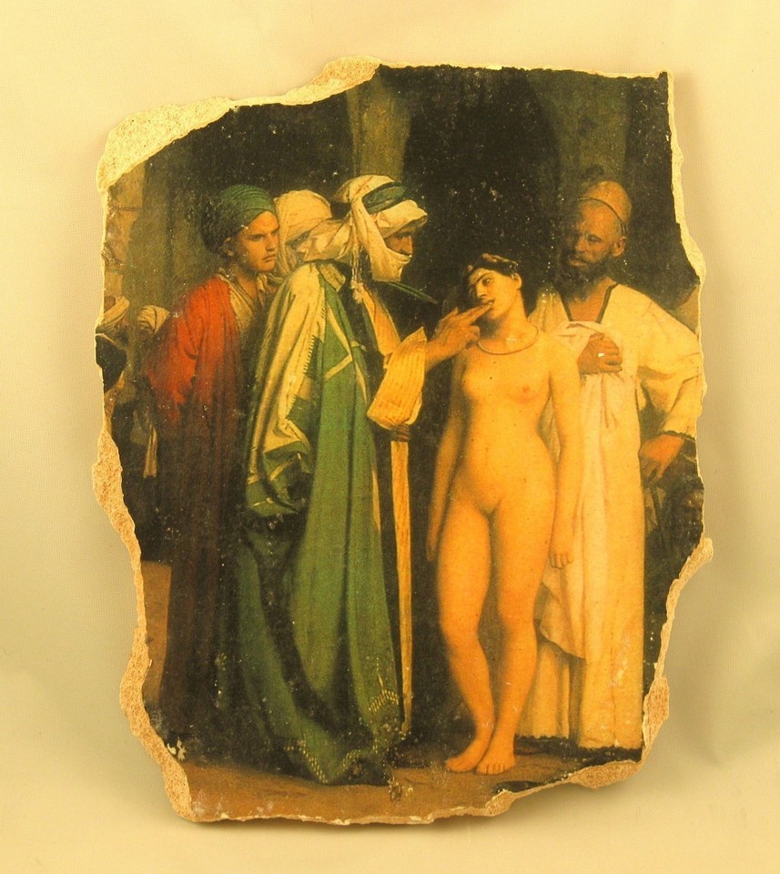 One of many slave girl pictures, by painter Jean-Leon Gerome. The scene is a slave market in Cairo, Egypt.