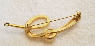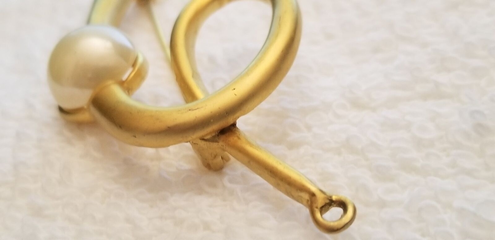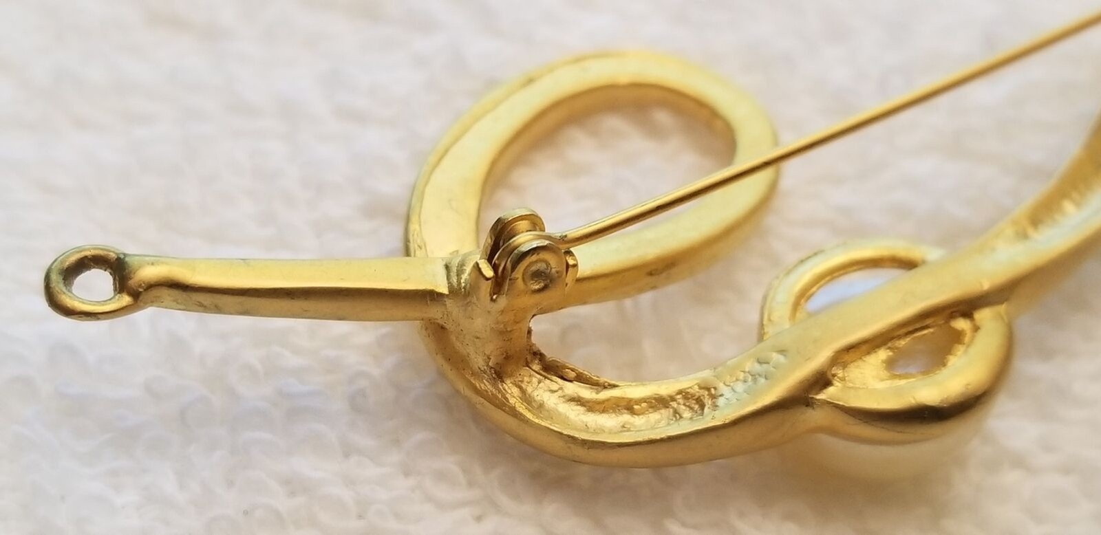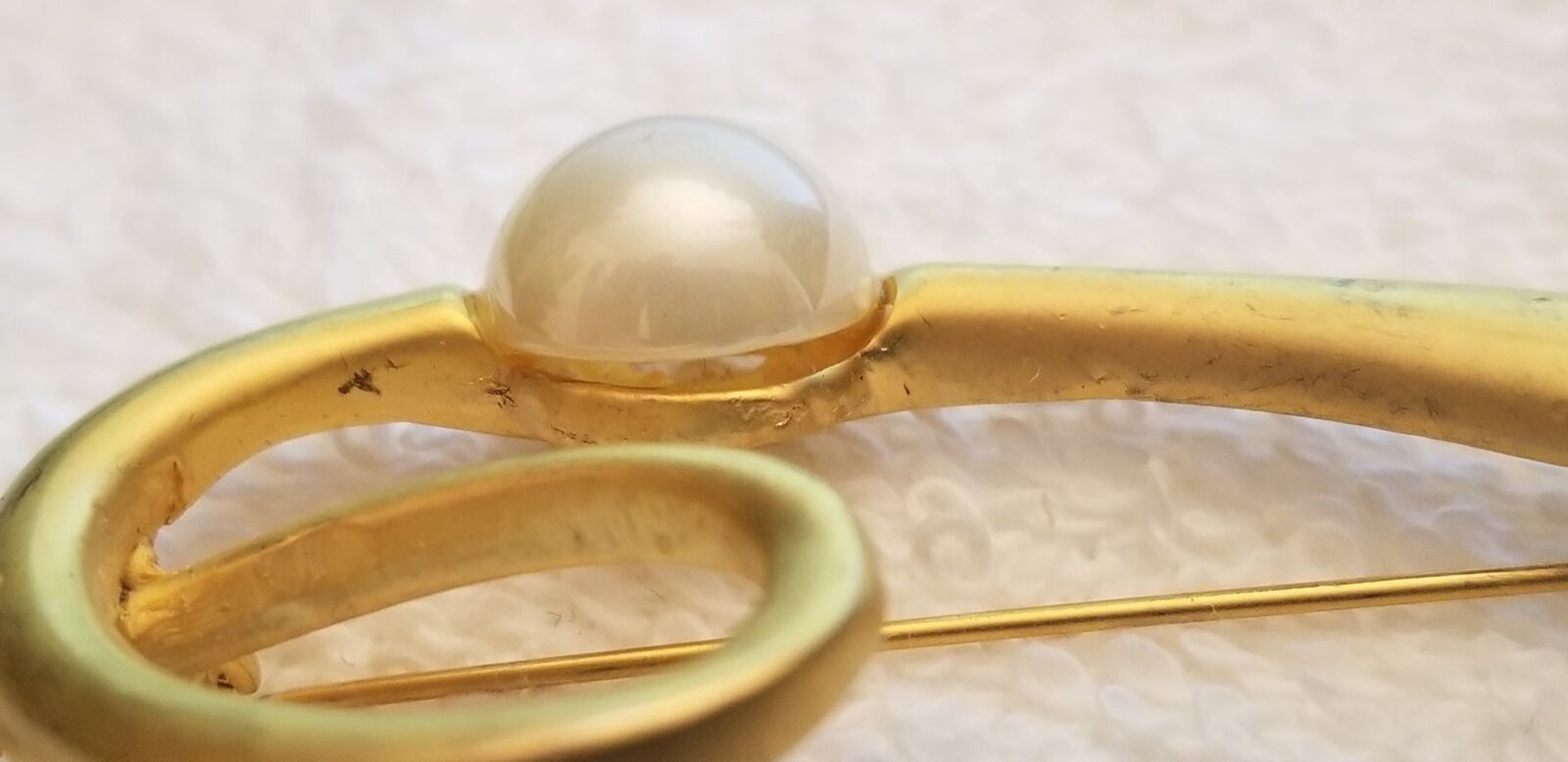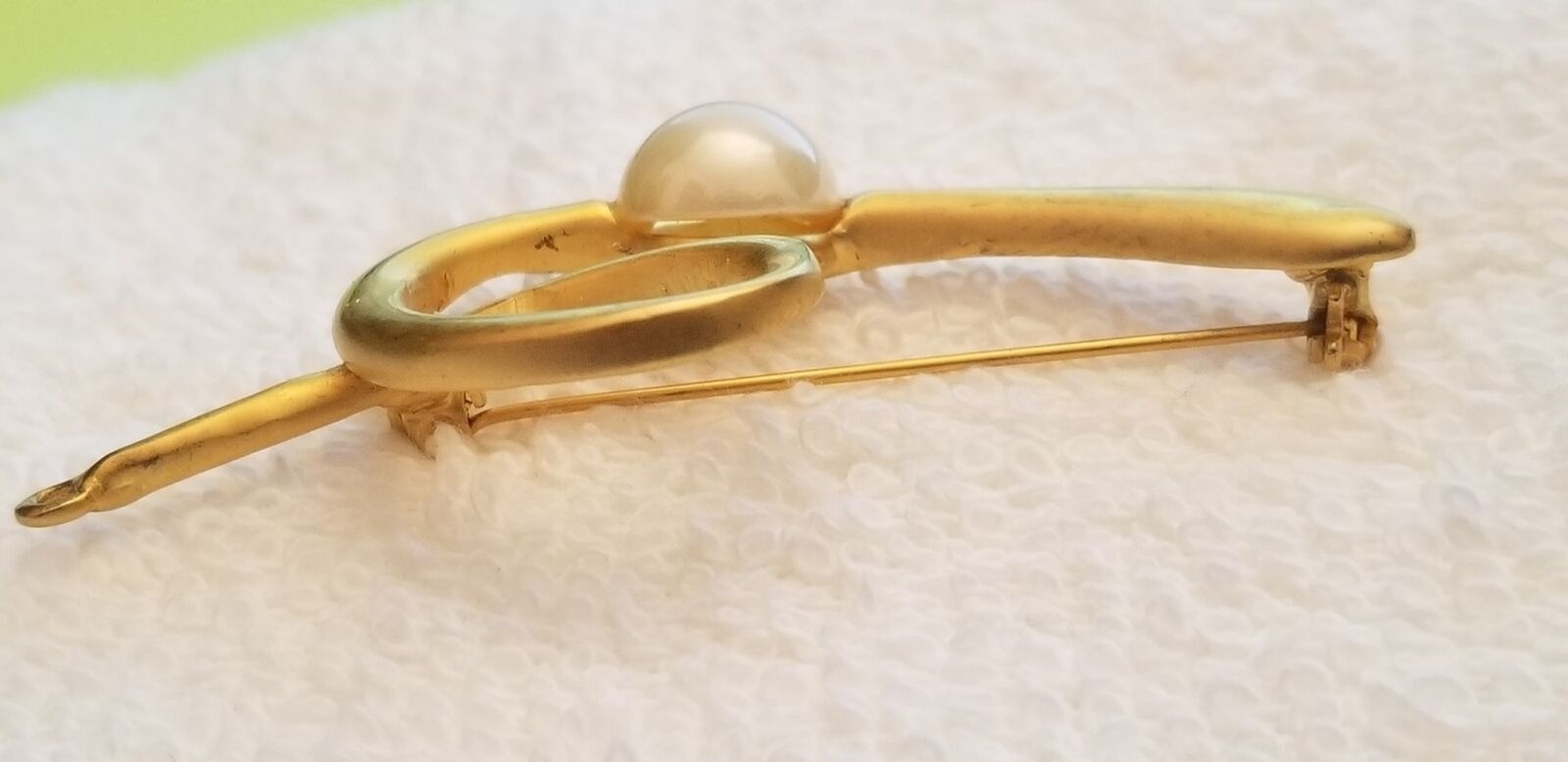 This vintage gold tone brooch features a sleek modernist swirl design accented with a single luminous faux pearl. The minimalist abstract shape gives it a chic mid-century appeal, making it a versatile piece that can be worn with both casual and formal looks.