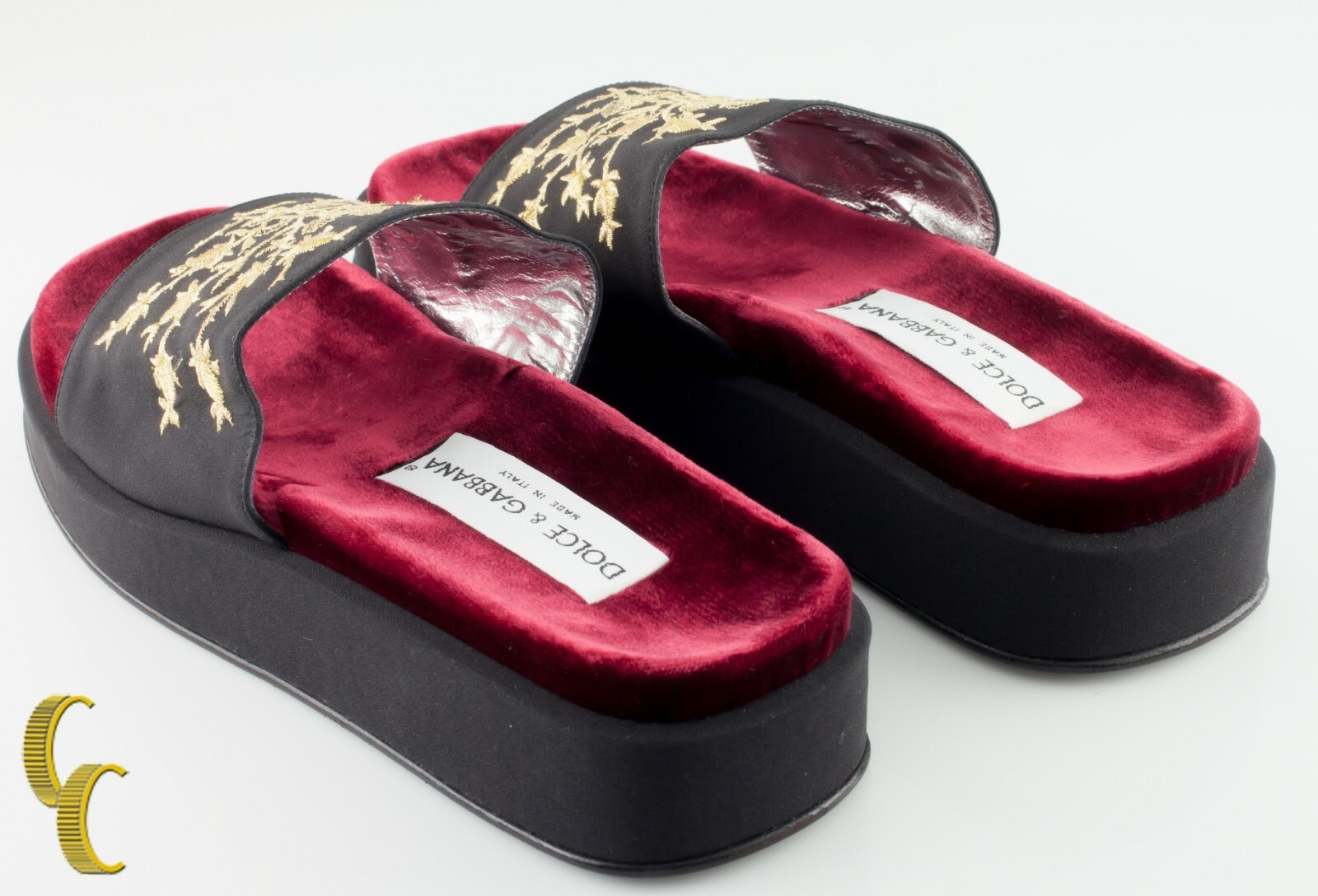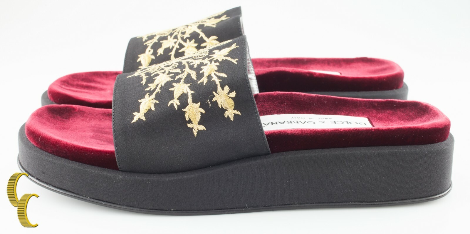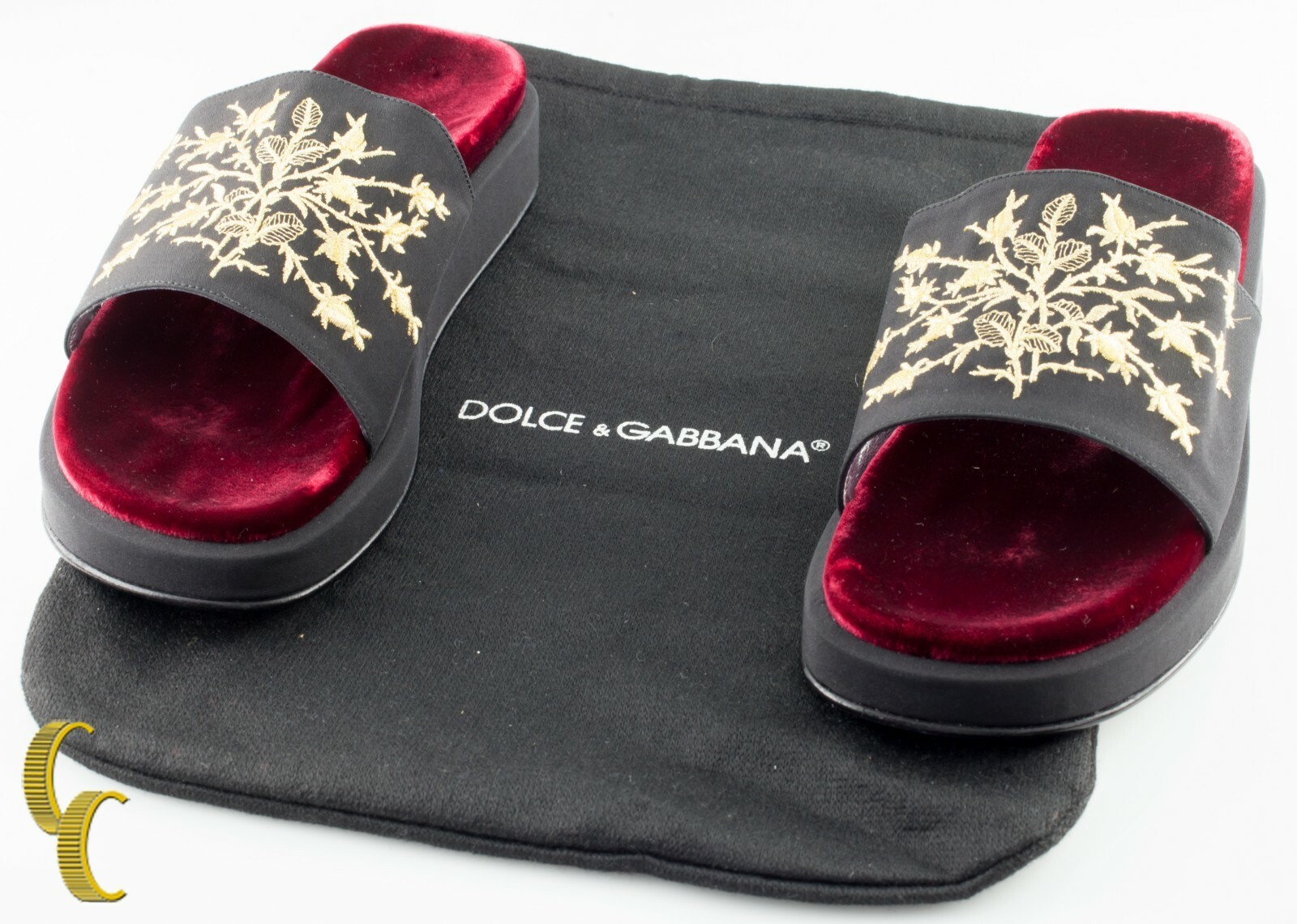 Dolce & Gabbana Velours Bout Ouvert Pantoufles W/Broderie Boite & Pochette