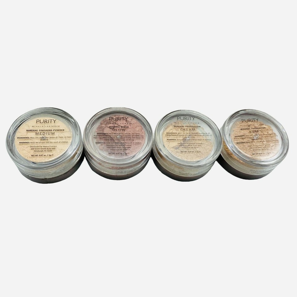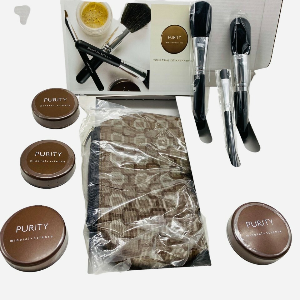 Purity by Mineral Science Mineral Finishing Powder Foundation Medium Shades.Starter kit conmes with3 Makeup Brushes , Make Up Cosmetic Bag1 Mineral Finishing Medium1 Mineral Blush Glow1 Mineral Foundation Buff1 Mineral Foundation Cream All Powders Are Sealed