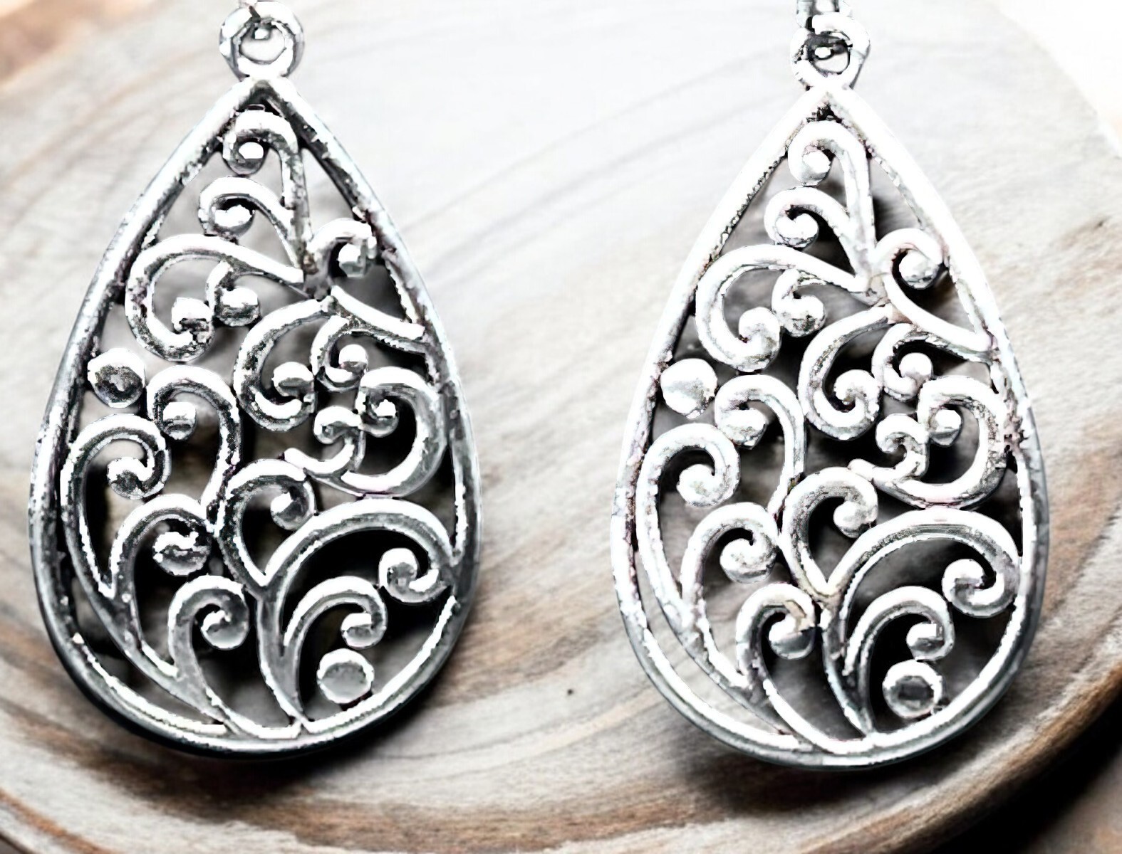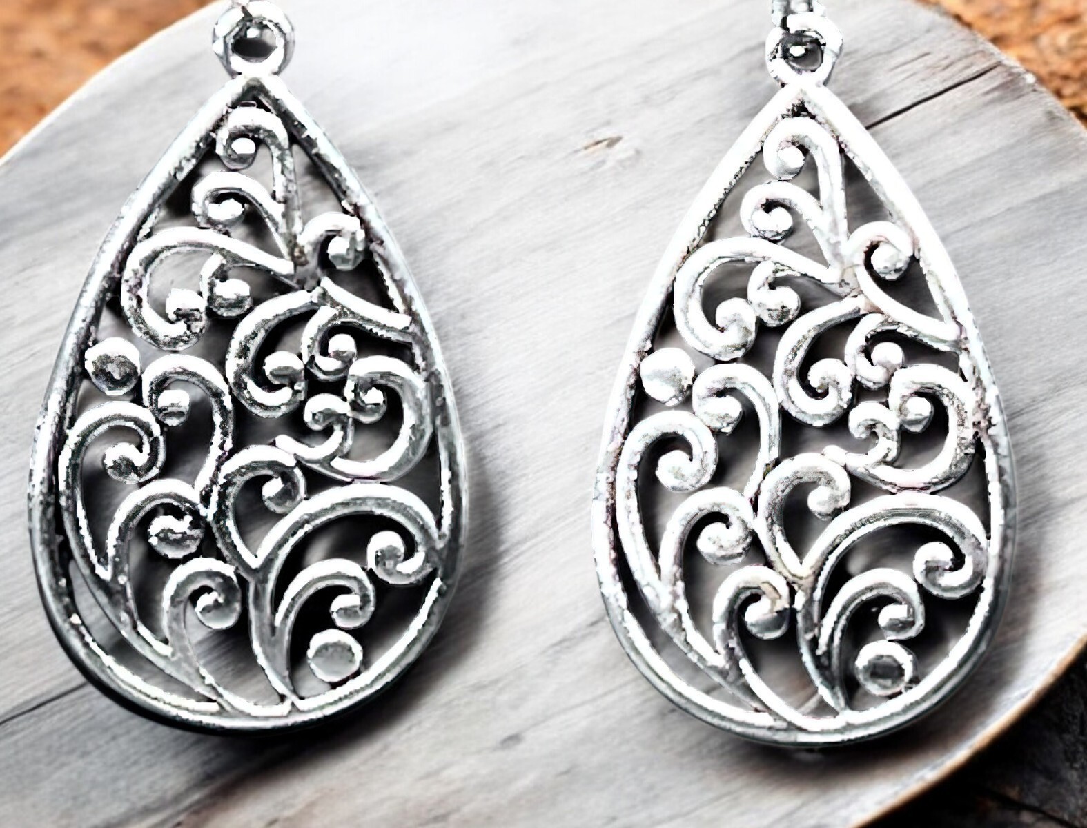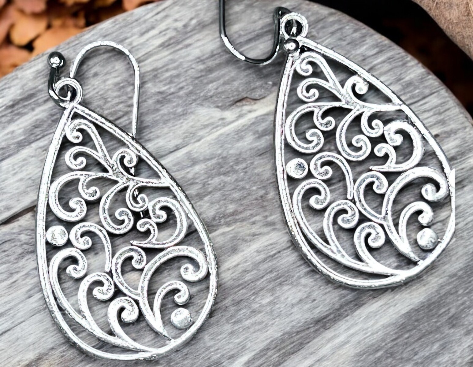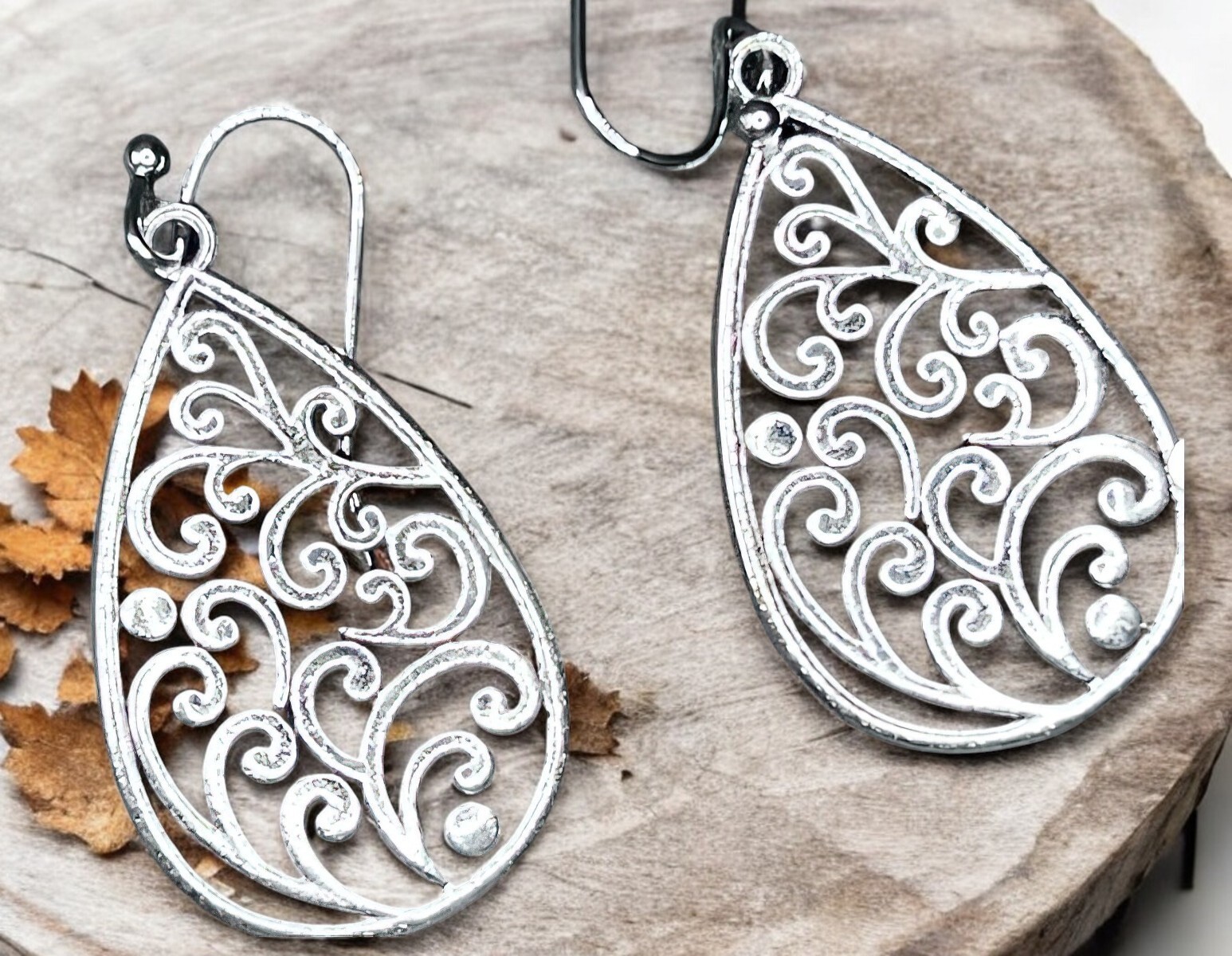 Vintage Boho Silver Dangle Earrings | Teardrop Swirl Design | 1.5" Fashion Jewel