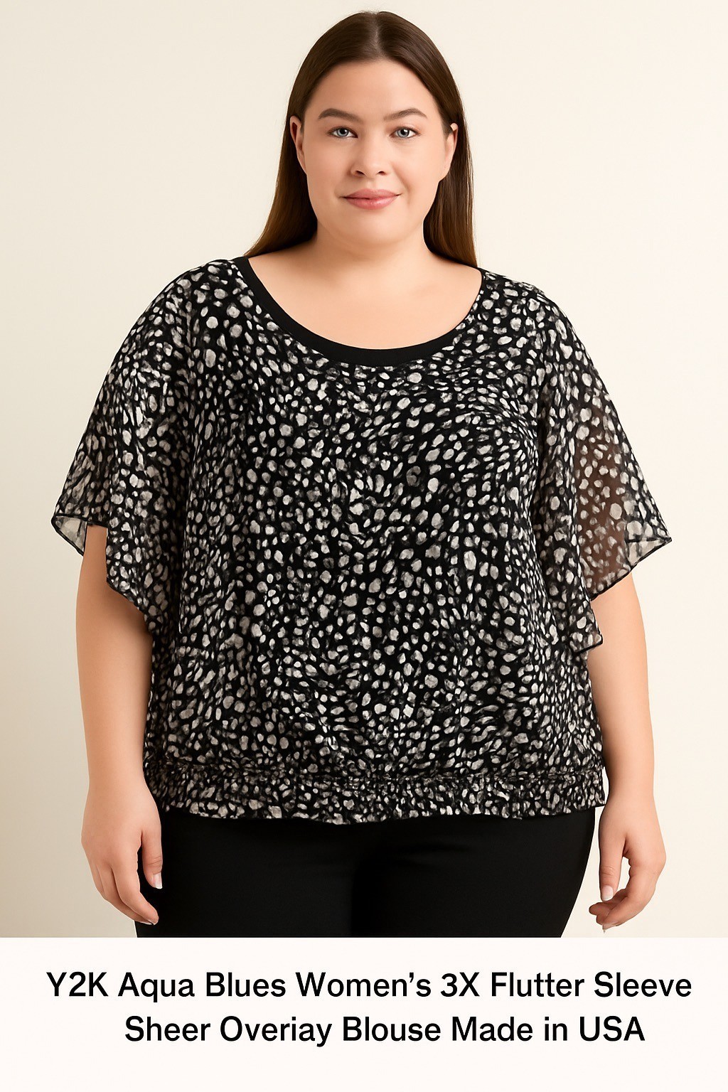 Y2K Aqua Blues Women’s 3X Flutter Sleeve Sheer Overlay Blouse Black White Animal