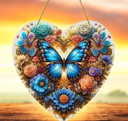 This vibrant 8-inch heart-shaped wall or window panel features a stunning blue butterfly surrounded by colorful flowers. Crafted from clear acrylic with a printed design, it captures the look of stained glass without the weight or fragility. A perfect piece to brighten up your home, patio, or sunroom.
