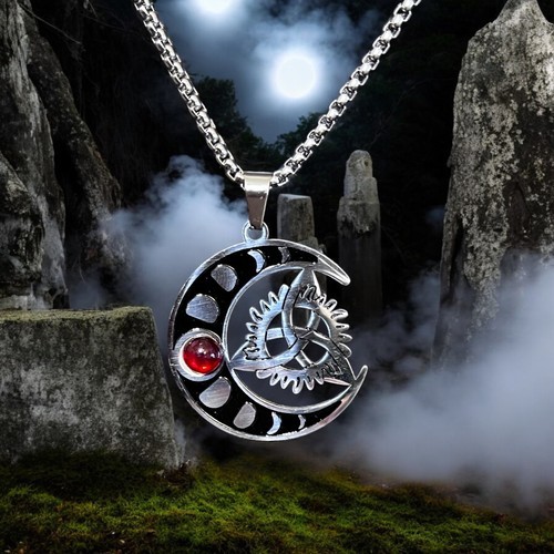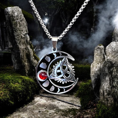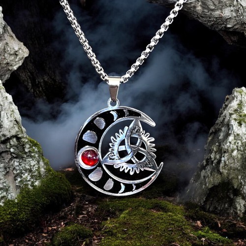 Crafted with intricate detail, this pendant showcases a crescent moon entwined with gears, symbolizing the balance between nature and technology, while the red gemstone adds a vibrant and dramatic touch to the design. Whether you?re attending a gothic event, steampunk gathering, or just expressing your unique style, this pendant necklace is the perfect accessory.