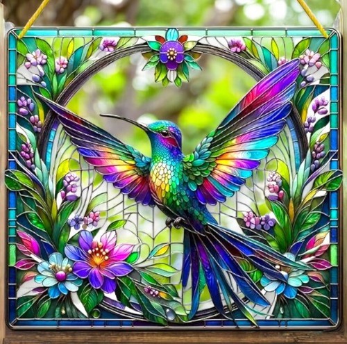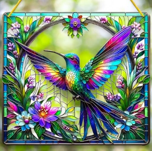 Square Hummingbird Faux Stained Glass Acrylic Art Suncatcher – 8in 2D Flat