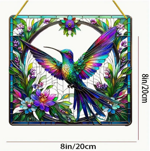 Brighten your home with this vibrant flat Faux Stained Glass Acrylic Art suncatcher, featuring a colorful hummingbird in mid-flight surrounded by lush flowers and greenery. Designed to look like stained glass, the piece shines beautifully in sunlight while remaining lightweight, shatterproof, and easy to hang.