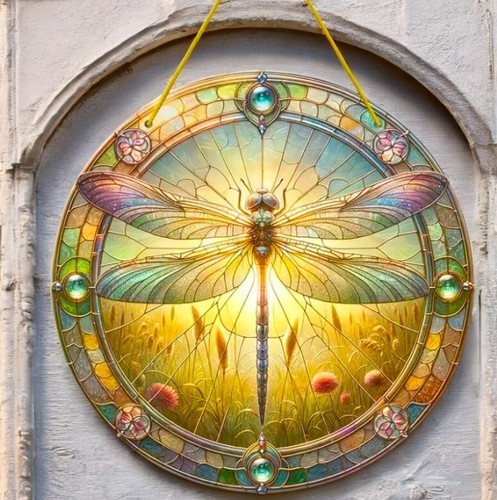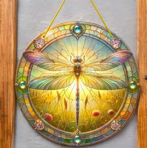 Dragonfly Faux Stained Glass Acrylic Art Suncatcher – 8in 2D Round Panel Decor