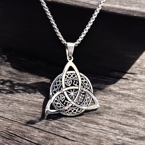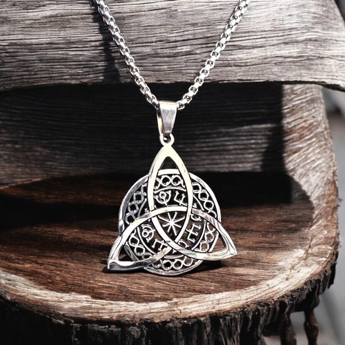 "Stunning silver pendant featuring the Triquetra symbol intertwined with intricate esoteric and celestial designs. A perfect representation of unity, eternity, and spiritual connection. Crafted with precision, this necklace is ideal for those drawn to mystical, Celtic, or symbolic jewelry. Elevate your style with this enchanting piece."