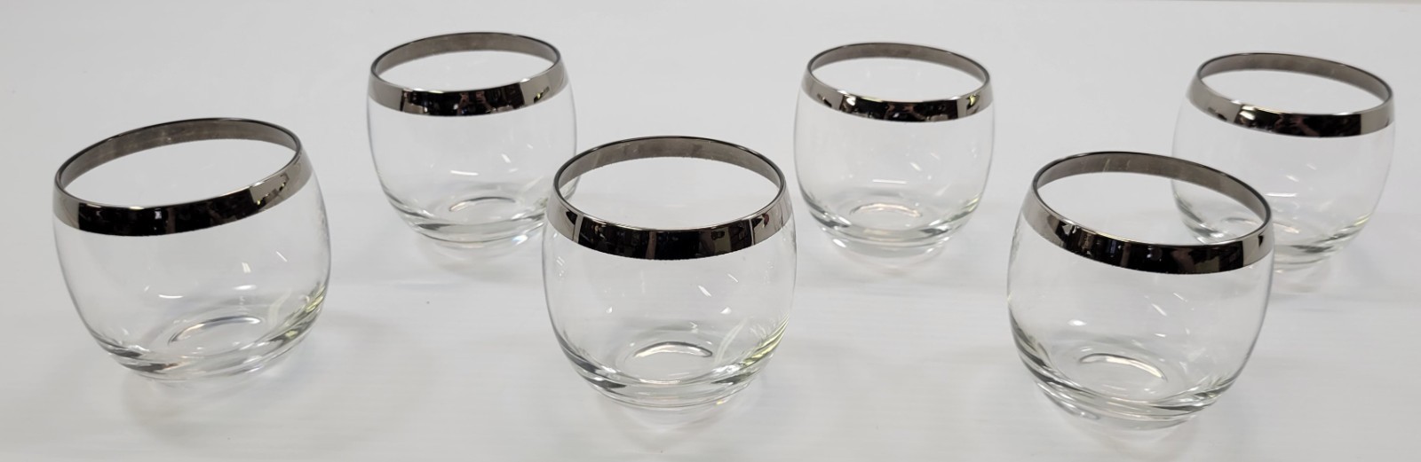 *A2) Vintage Set of 6 Roly Poly Silver Tone Rim Cocktail Bar Glasses