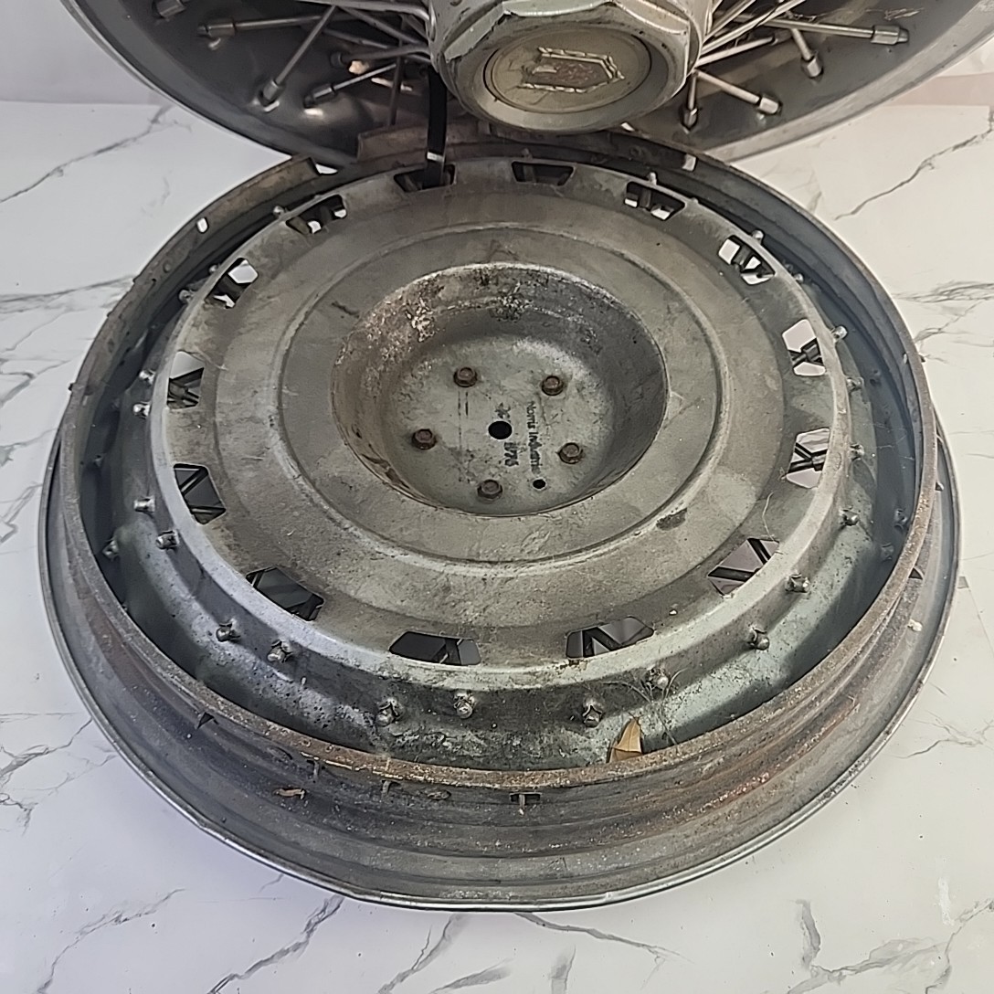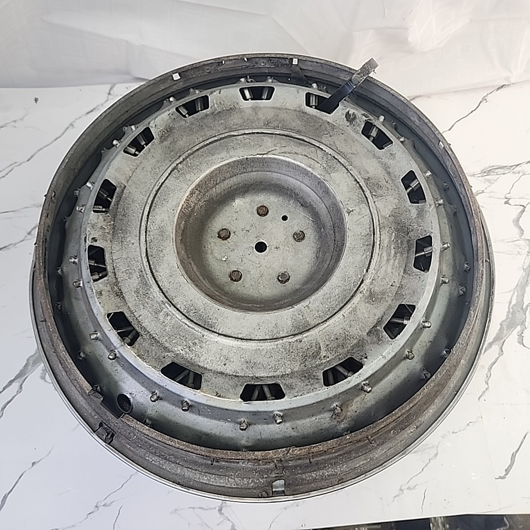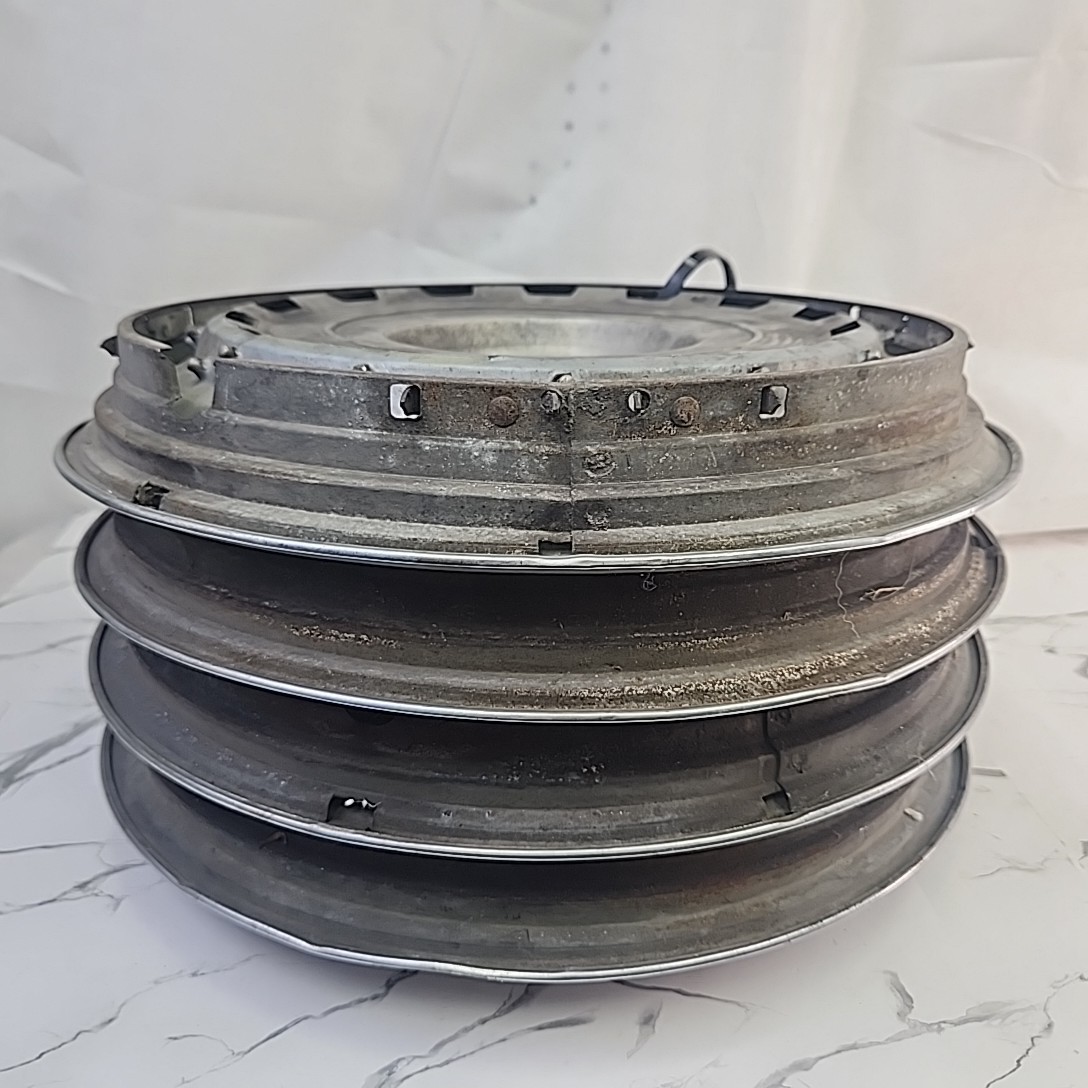 Exact item set is shown. In good used condition, some surface wear and scratches/dents. Mounting rings are intact. Inner diameter 13 inches. Outer diameter 15 inches. Set weight 20 lbs. Made in USA. No returns on partial sets. Please review our business policies in our store for information regarding returns, shipping and warranties.