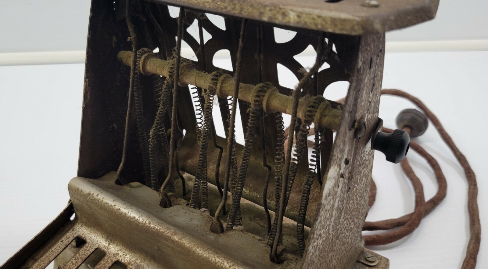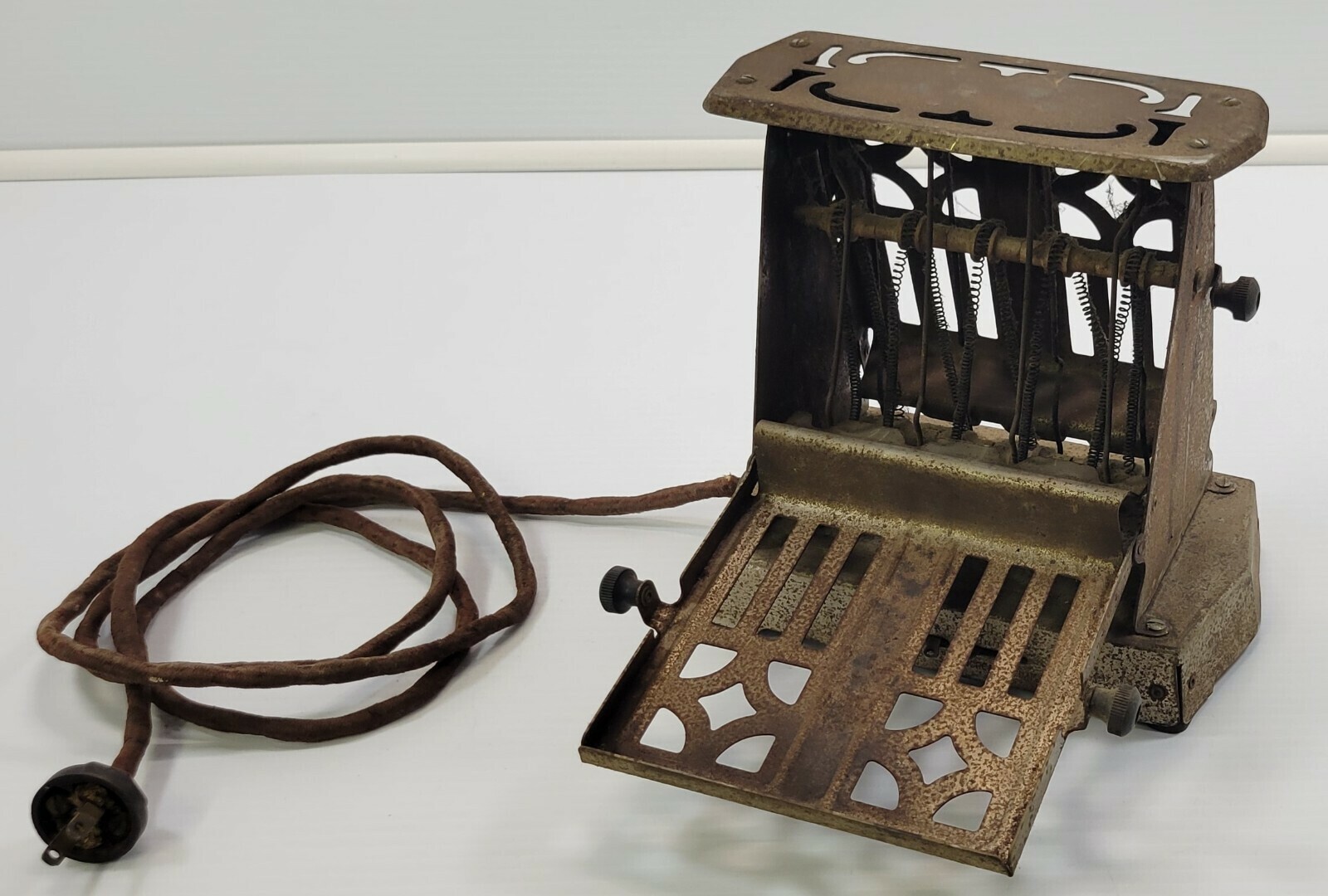 Toaster is NOT in usable condition. It is an antique piece with frayed electrical wire that is NOT SAFE to test. Toaster shows signs of age including dings, dents and surface rust. Seems like a solid piece making a good candidate for restoration.