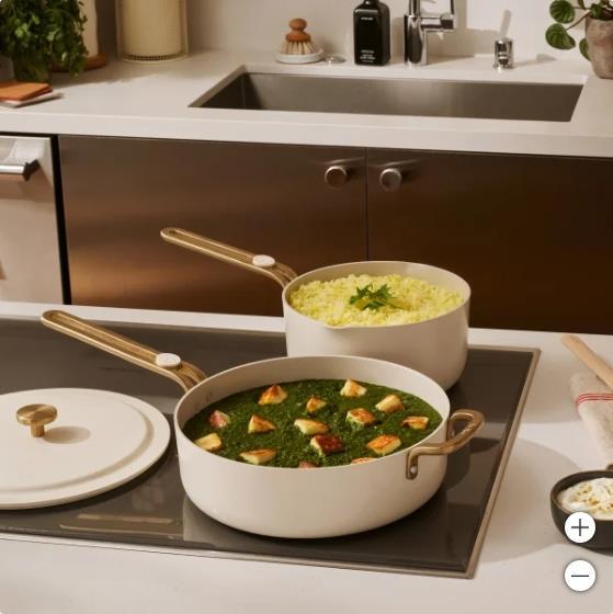 The Our Place 14-piece Essentials Ceramic Nonstick Cookware Set includes a 8-inch fry pan, 10-inch fry pan, 12-inch fry pan, 1.5-quart saucepan with lid, 3-quart saucepan with lid, 4-quart saute pan with lid, 7-quart stock pot with lid, and three flexible silicone liner for convenient storage. Each piece features Our Place?s exclusive Thermakind nonstick coating, made without PFAS (including PTFE), lead, or cadmium, for healthier cooking and easy cleanup. Designed with practical details like easy-pour spouts, flush rivets, and ergonomic handles with removable silicone thumb rests, this set supports everyday cooking needs. The durable aluminum construction delivers even heat distribution, while each piece is oven safe up to 450 F and compatible with all stovetops, including induction. Backed by a 3-year warranty, this set is the modern upgrade to the traditional cookware set, combining superior performance with Our Place?s iconic design.