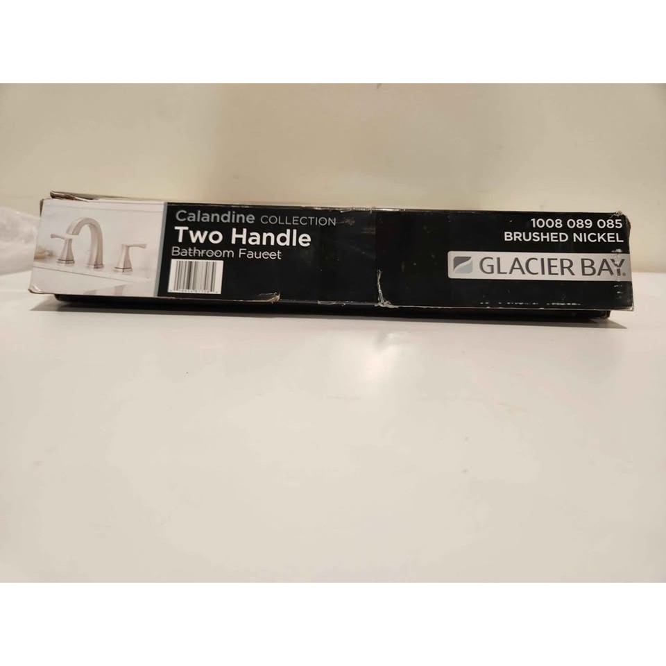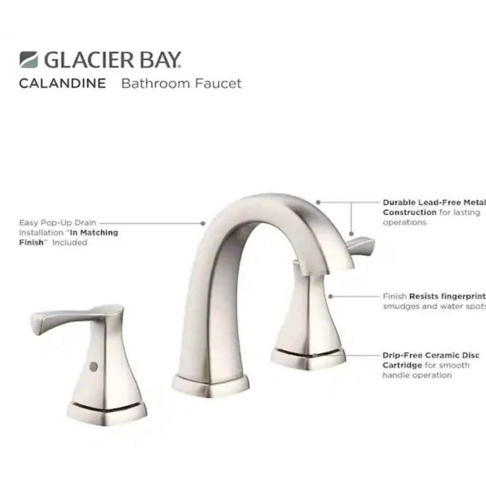 New open box Glacier Bay Calandine bathroom faucet. Never installed. All parts included: faucet body, hot and cold handles, push-down drain, and mounting hardware.