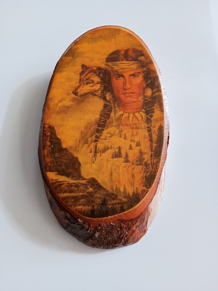 This vintage wood wall plaque featuring a Native American spirit and wolf design is a unique and stylish addition to any room. Handmade in Pennsylvania, USA, this hanging plaque is crafted from wood with a multicolor Native American theme. Its oval shape makes it a versatile piece of home decor that can complement any room's style or subject. Perfect for adults who appreciate animal-themed art, this wall plaque brings a touch of nature and heritage into any living space. Normal wear. All sizes are approximate.