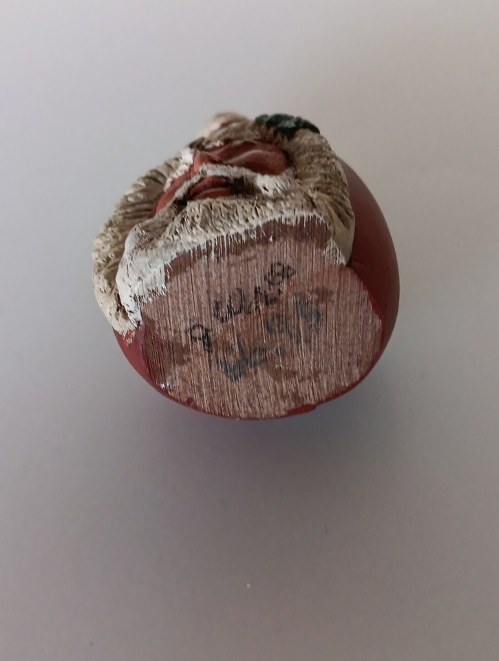 This unique Christmas decoration features a hand-painted Santa Claus in a folk art style. Measuring approximately 3 inches in height, this round, multicolor figurine is made of natural material and has a matte finish. It was originally manufactured in 1992 and is an original piece.