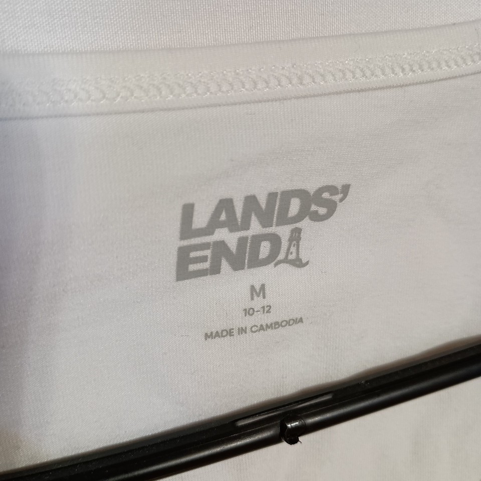 This product is a Lands' End women's white long sleeve top in size M (10-12). Made from a soft stretch cotton blend, this pullover base layer is ideal for casual occasions. The solid white color and classic sleeve length make it suitable for all seasons - winter, summer, fall, and spring. With its comfortable stretch material and dependable brand, this top is a versatile addition to any woman's wardrobe. New