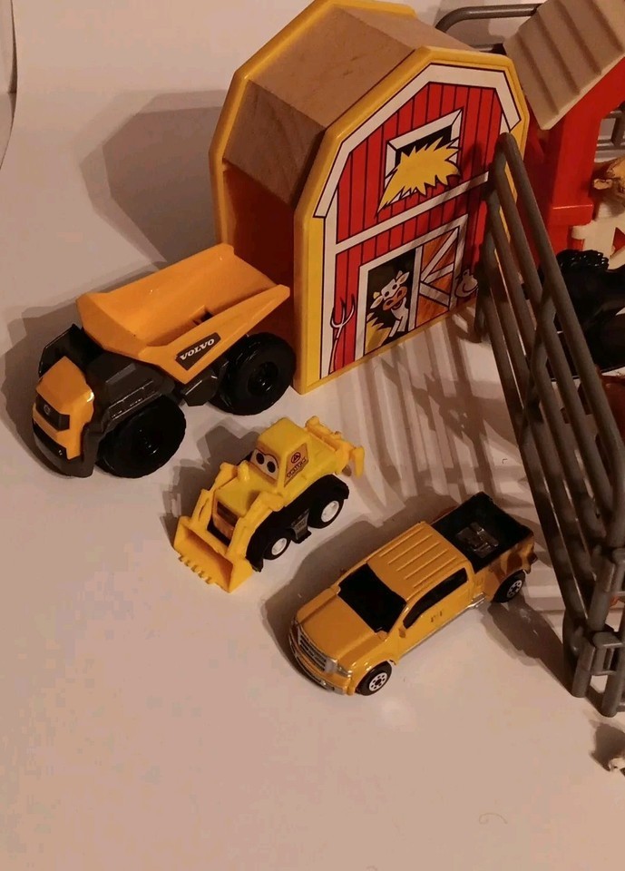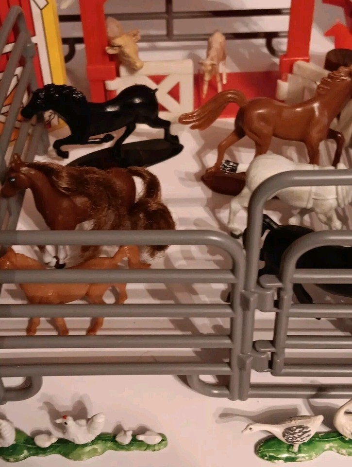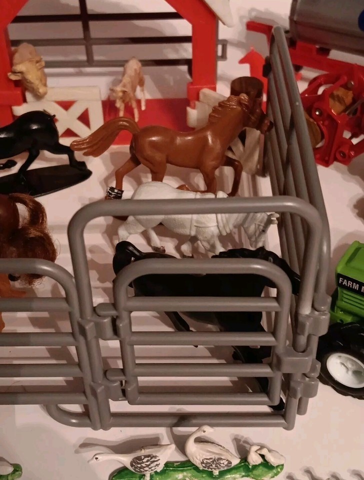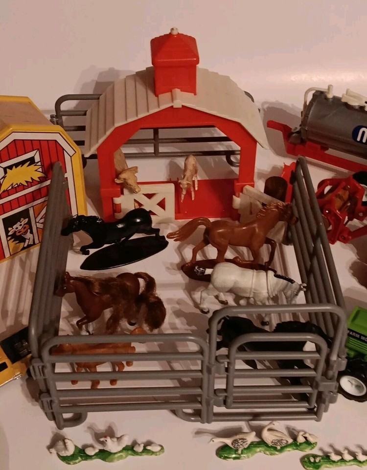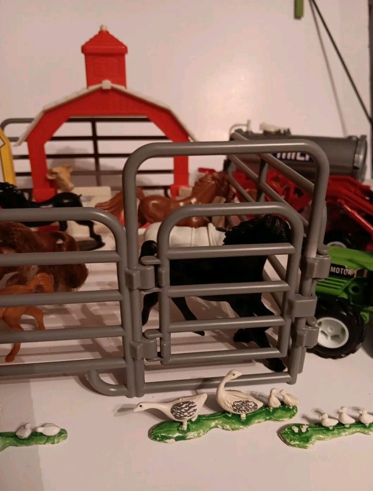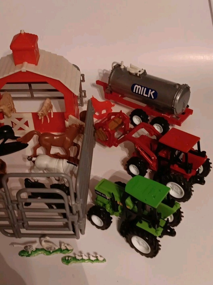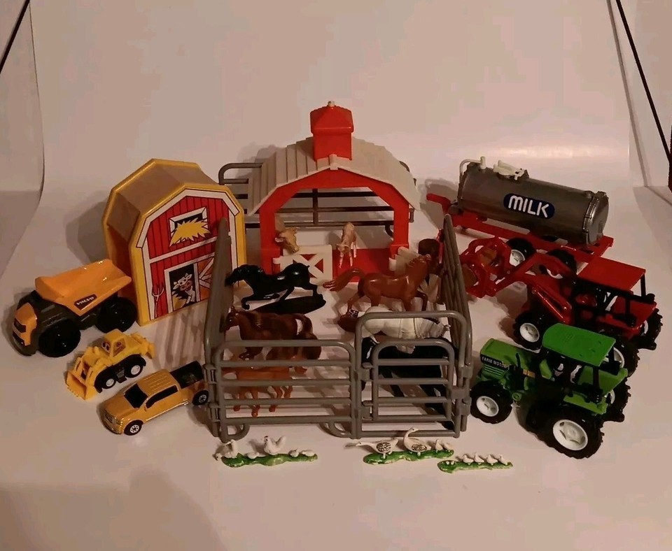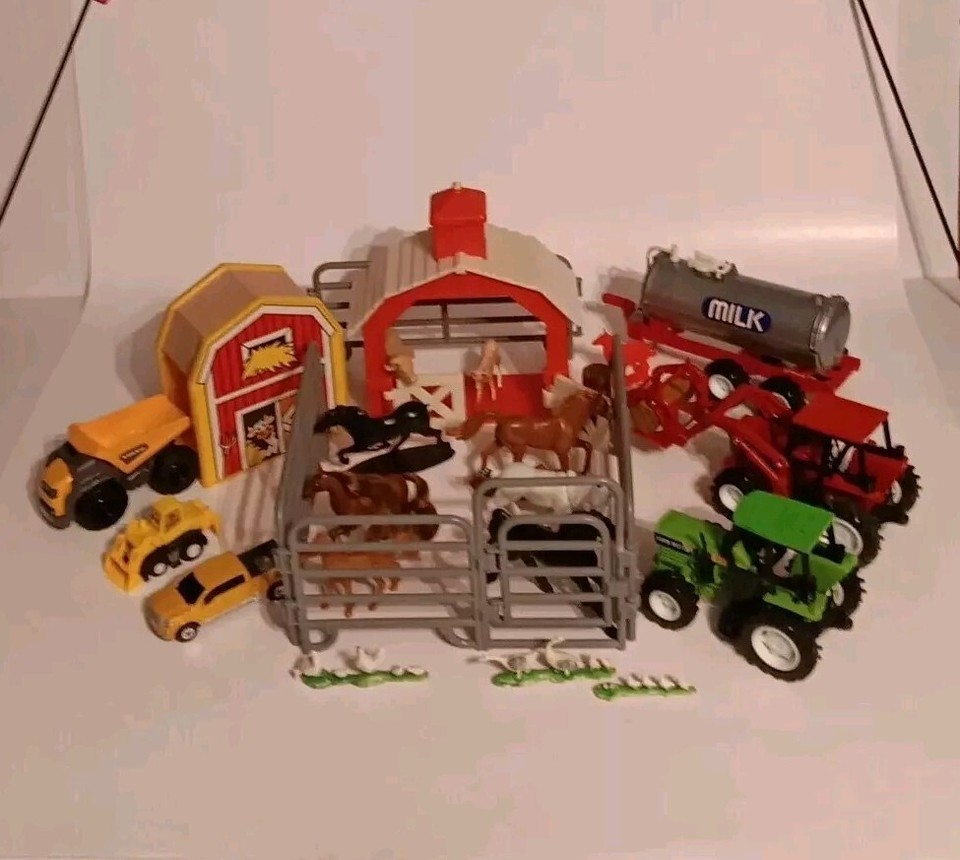 This large lot of mixed plastic farm toys includes tractors, animals, and other miscellaneous items such as gates and barns. The collection features toys that are perfect for collectors or those who enjoy nostalgic playtime. The origin of manufacture is unknown, but the character family is plastic farm tractors and toy animals. This collection is a must-have for anyone who loves farm-themed toys and wants to add some nostalgia to their collection.Normal wear. See Pictures.