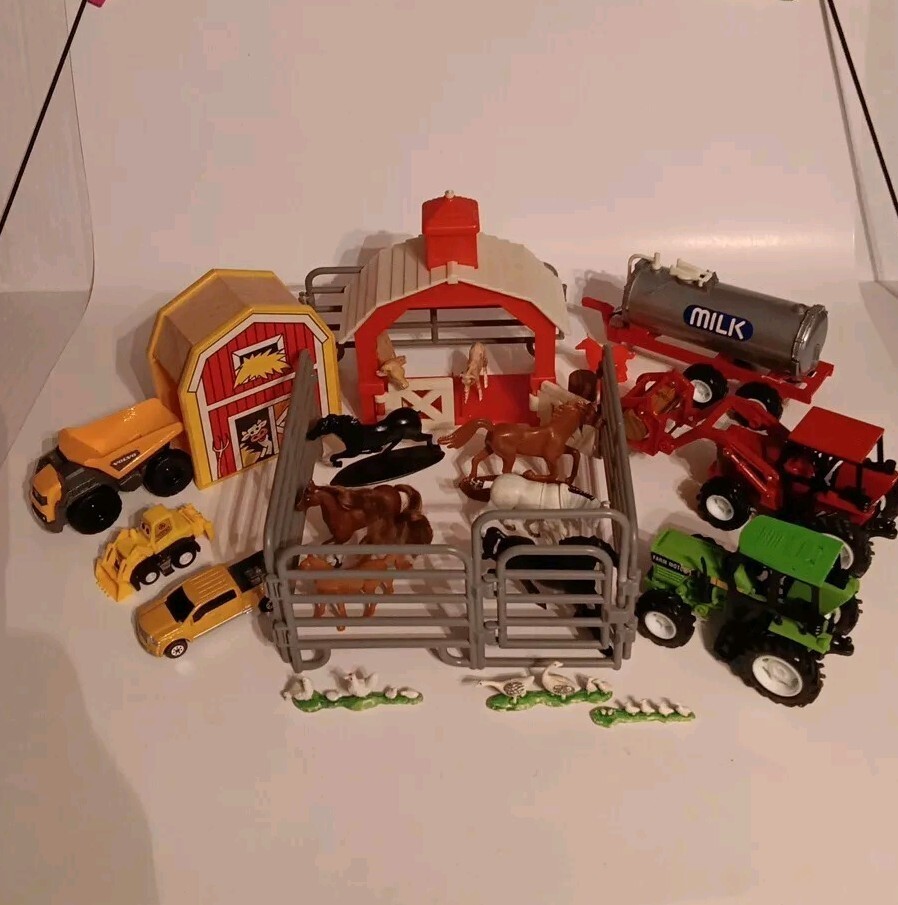 Large Lot Mixed Plastic Farm Tractors, Farm Animals, Barn, Gate, and Other Misc.