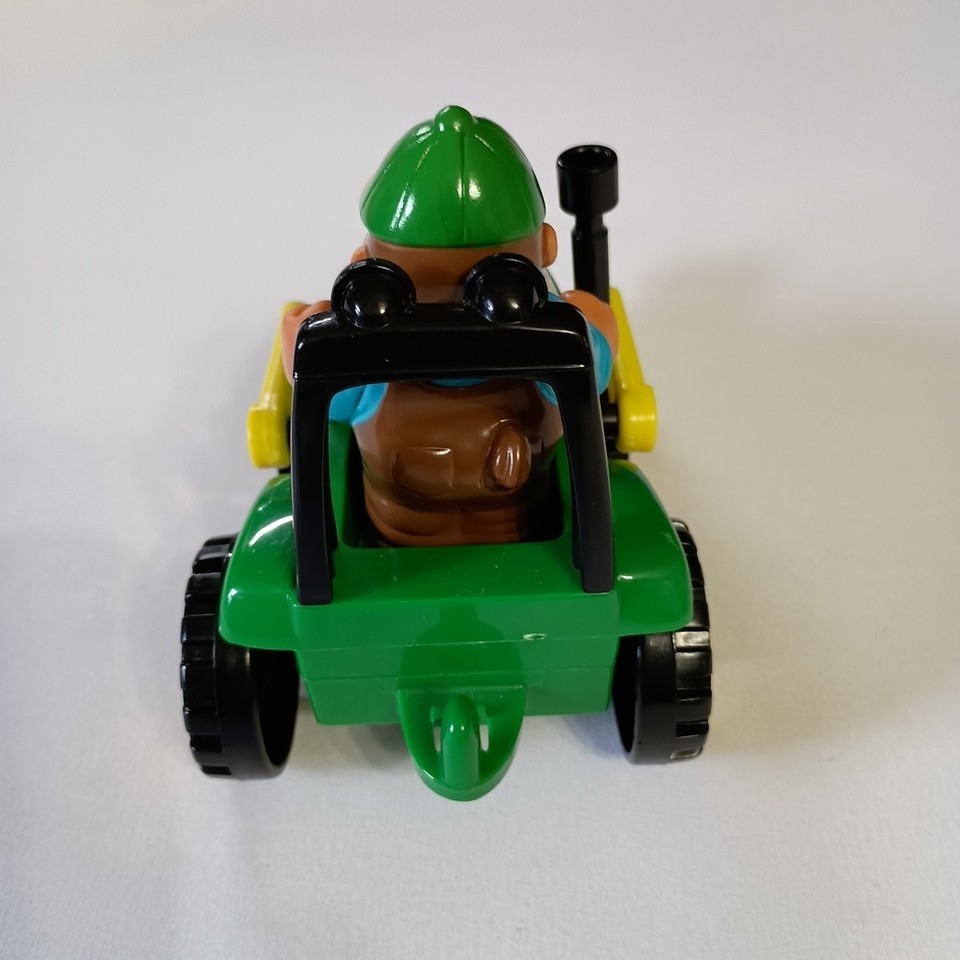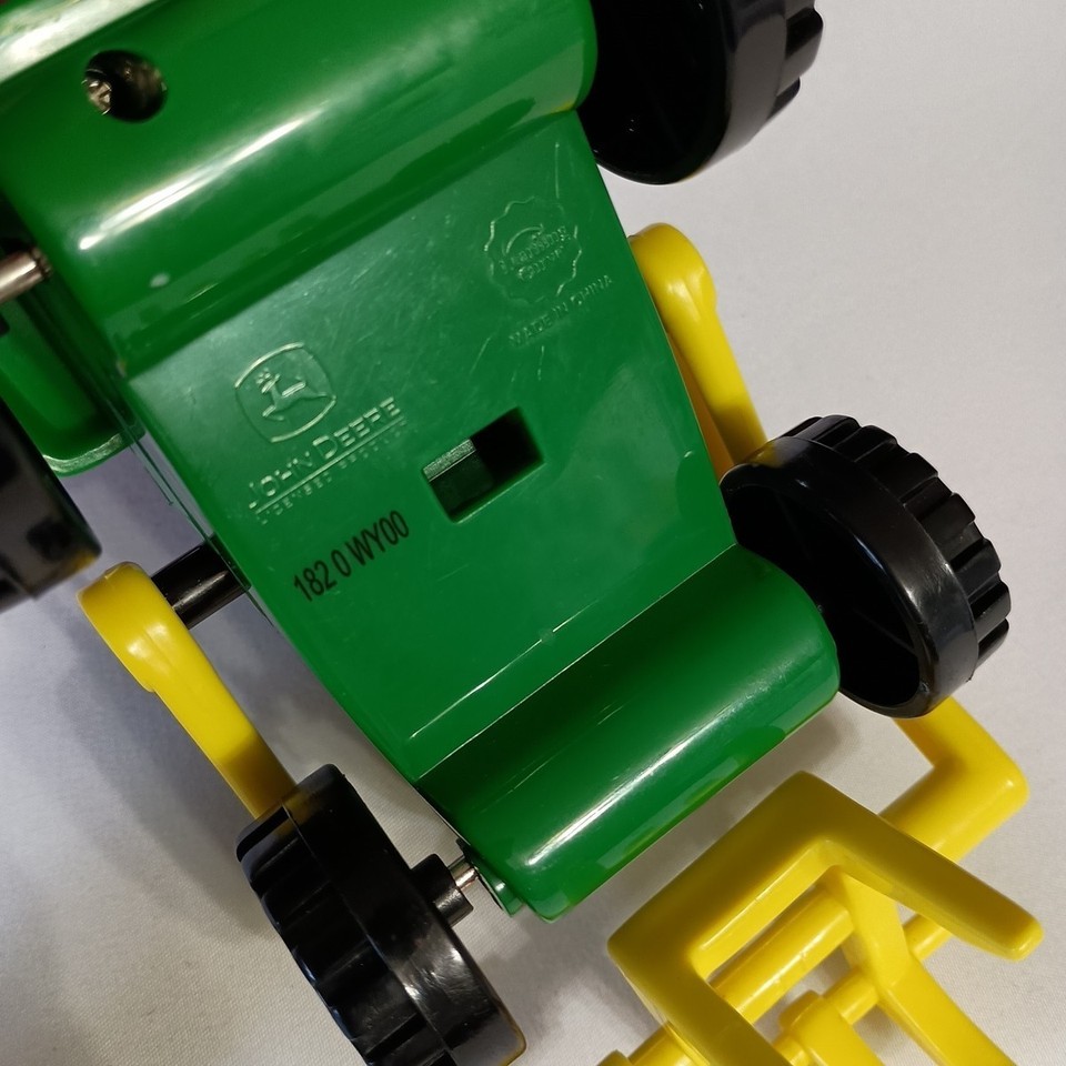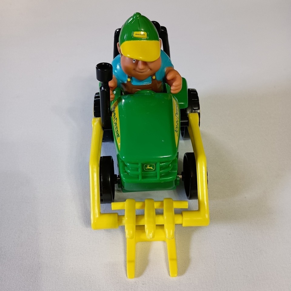The John Deere Tractor Hay Fork Loader is a detailed farm vehicle toy designed for imaginative play. With the iconic John Deere brand and character family, this toy is perfect for young farmers and farm enthusiasts. The toy allows children to simulate real-life farming chores and activities, promoting creativity and role-playing. This set includes a tractor and a farmer figure, making it a comprehensive addition to any preschool or pretend play collection. Normal wear. Sizes are approximate.