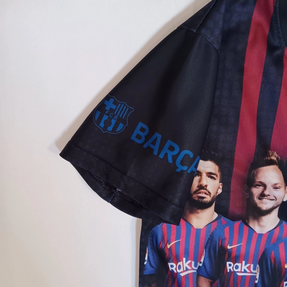 The FCB-Shirt Barcelona Rakuten in size 10 youth is a blue multicolor polyester t-shirt featuring a print of players from FC Barcelona. With a crew neck and short sleeves, this regular fit shirt is perfect for teens who are fans of the soccer team. The shirt also includes the official FC Barcelona logo, making it a must-have for young fans of the sport and team. Normal wear.