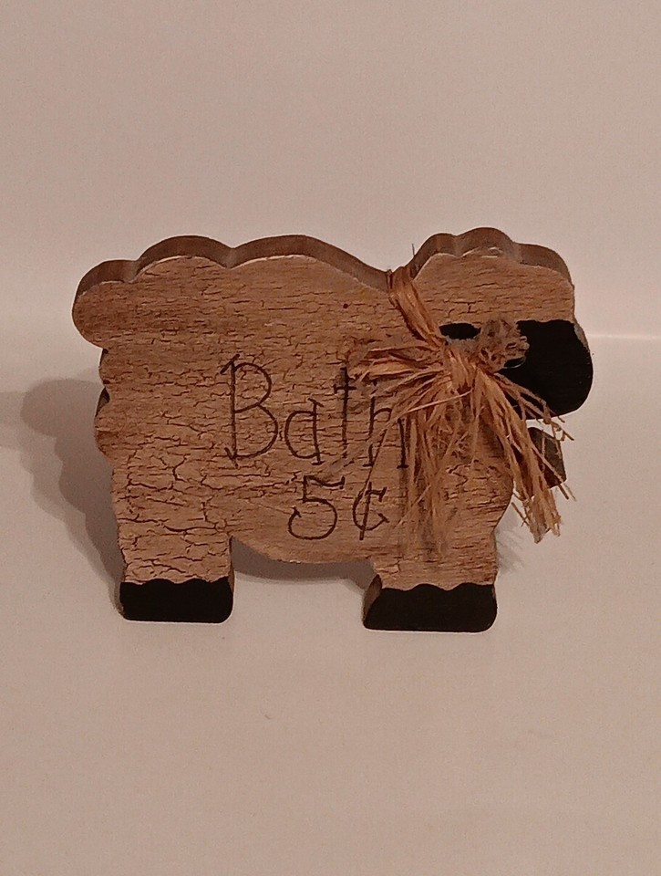 Wooden Bathroom Wall Plaque Sign Bath 5 c' Sheep Shaped w/Bell Primitive Rustic