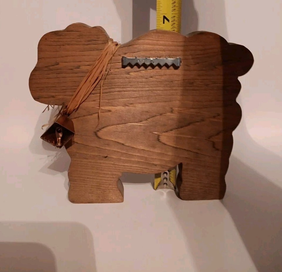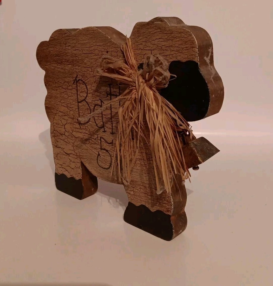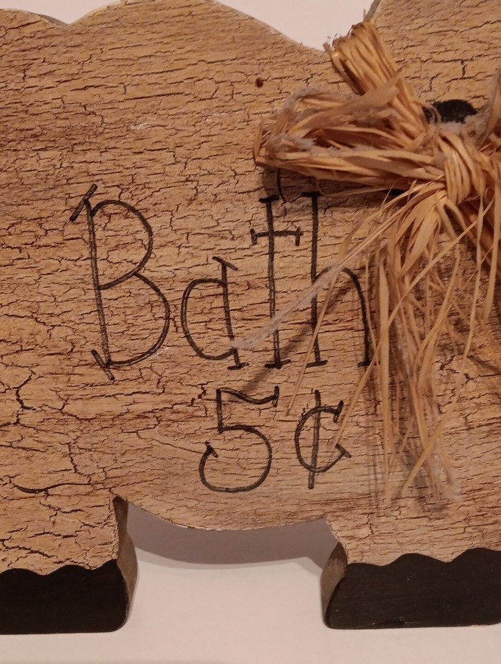 This unique wooden plaque sign features a cute sheep design with a bell primitive rustic touch. Perfect for adding a touch of charm to your bathroom or any room in your home. Crafted by hand with high-quality materials, this sign is sure to be a standout piece. The sign is made of wood and has a charming design that will add character to any space. This is a pre-owned item with normal wear. See Pictures