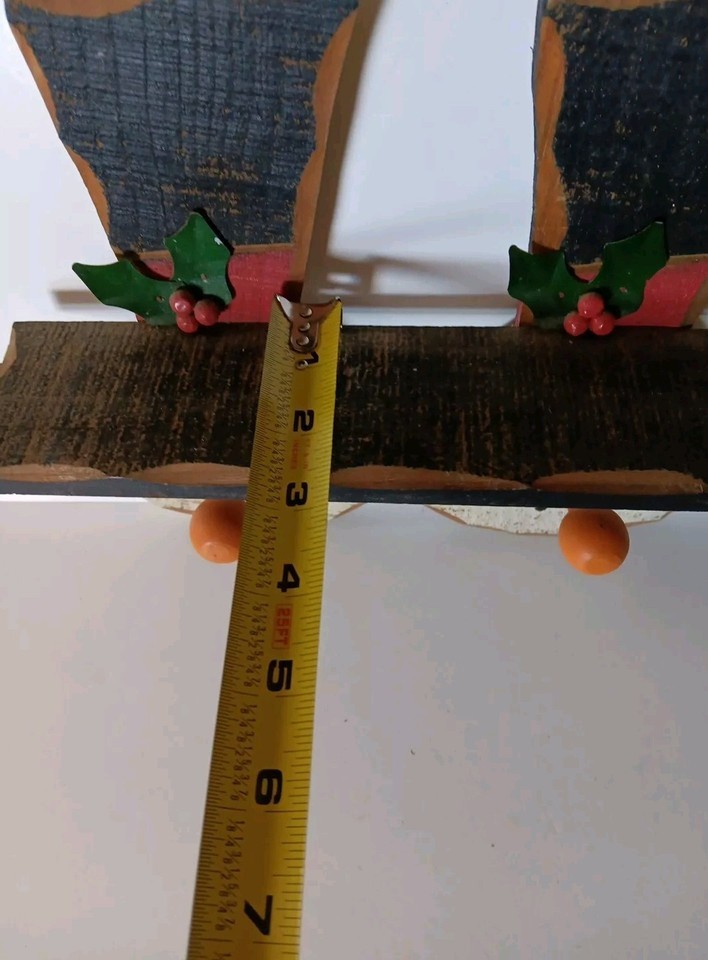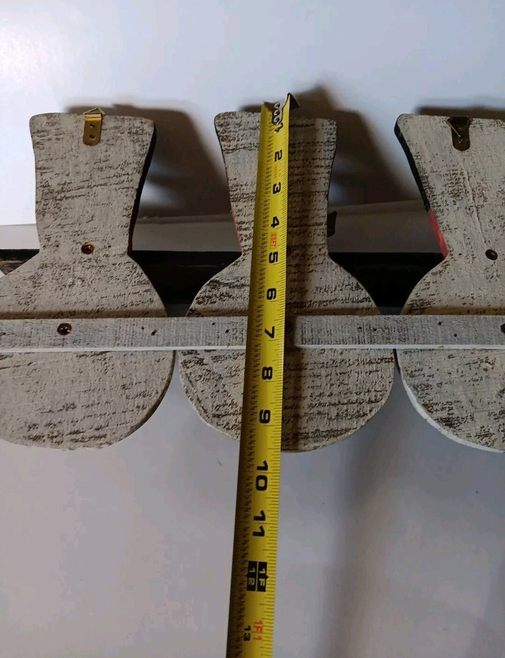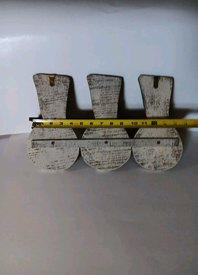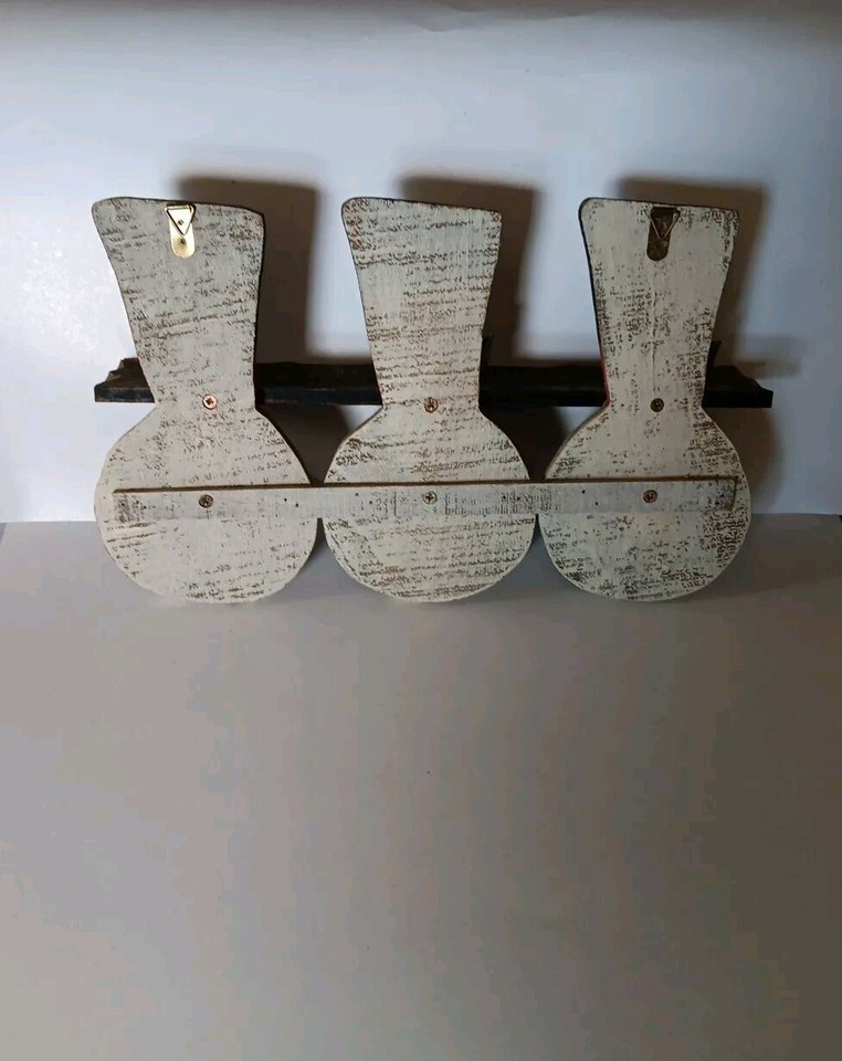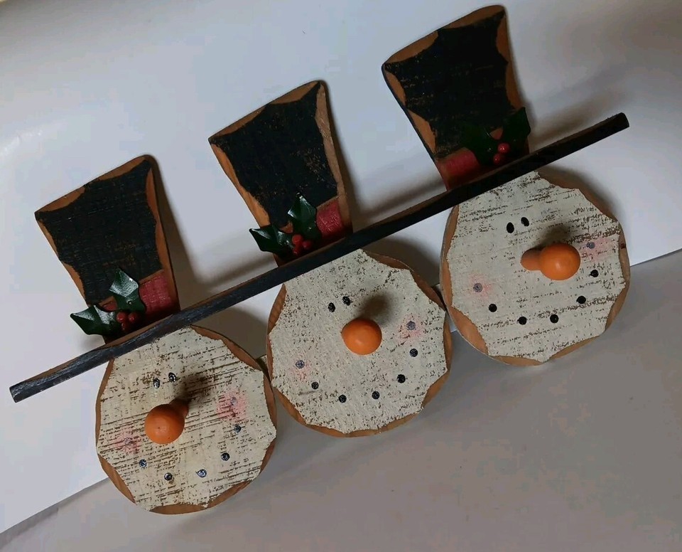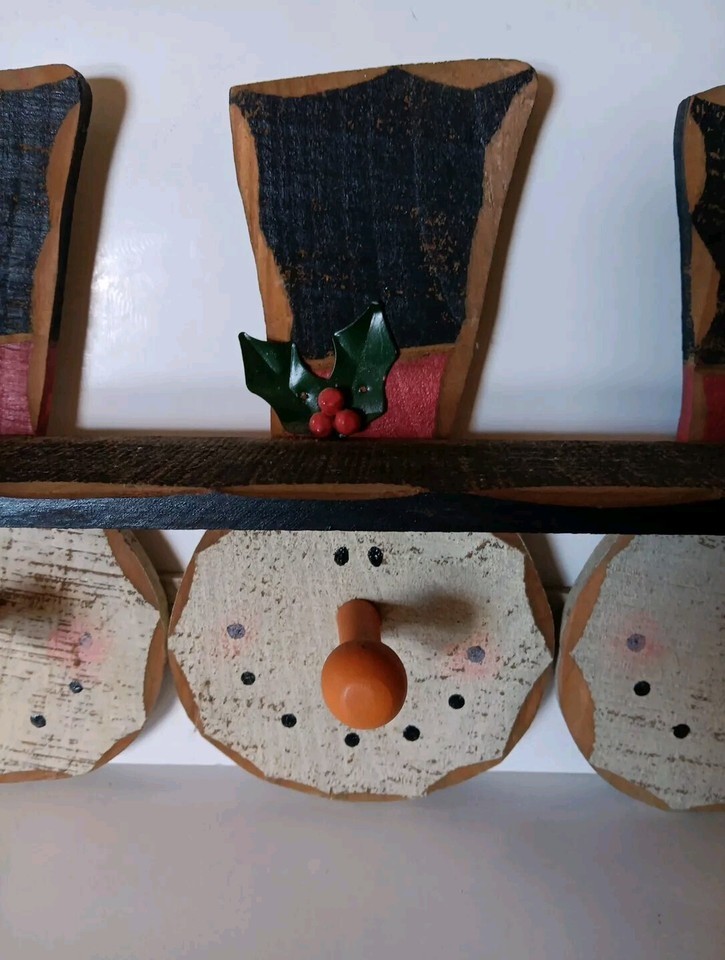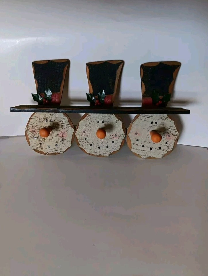 Get into the winter spirit with this charming country shelf featuring three snowmen with top hats. Perfect for wall hanging in any room, this small wooden shelf measures approximately 16 inches in length and 9 inches in height the shelfitself is about 3" wide. The multicolor design adds a festive touch to your Christmas decor. Ideal for adults, this snowman shelf is great it has three pegs for hanging your keys, etc. and would be a great addition to your home or garden. Its primitive and country farmhouse style makes it a unique and rustic piece that is sure to bring joy to any space. Whether you're looking for a Christmas gift or simply want to add some winter cheer to your own home, this snowman shelf is a must-have. Normal wear.See Pictures.